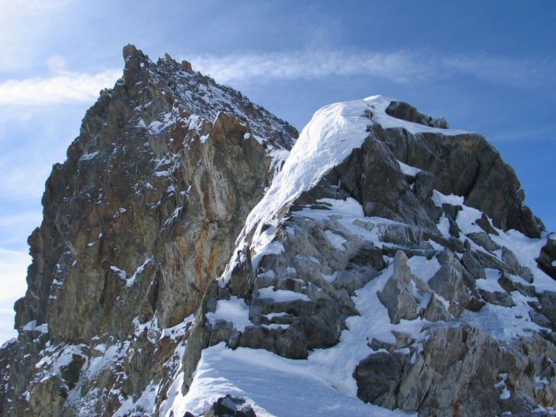 Der anspruchvollste Teil der Tour beginnt am 4094m hohen Hugisattel: Von hier geht es über einen, zum Teil sehr exponierten, Grat auf den schmalen Gipfel. Das Wetter ermöglichte zeitweise Fernsichten auf Matterhorn und Mont Blanc. Beim Abstieg erlaubte die Zeit auch noch eine kurze Toprope-Kletteraktion in der angsteinflößenden Finsteraarhorn-Nordwand, bevor wir über teilweise firnige Hänge zurück zur Hütte fuhren.