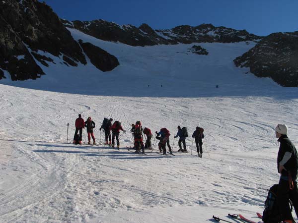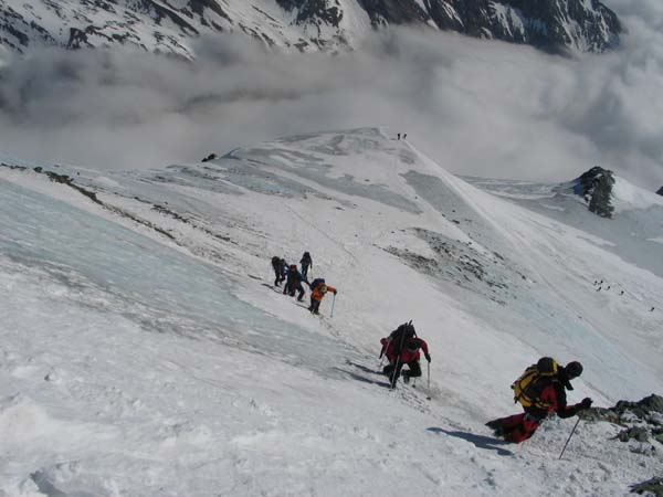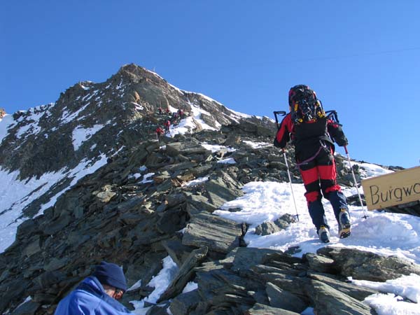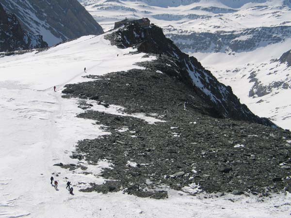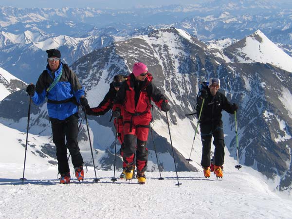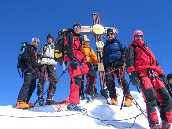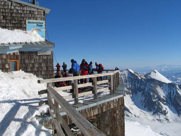 Am Sonntag stiegen wir dann zusammen zur Österreichs höchstgelegensten Hütte, der Adlersruh-Erzherzog-Johann-Hütte (3.454 m), auf. Bei wolkenlosem, aber leicht windigem Wetter erreichten dann vierzehn Personen den Gipfel des Großglockners (3.798m) und genossen ein herrliches Panorama.