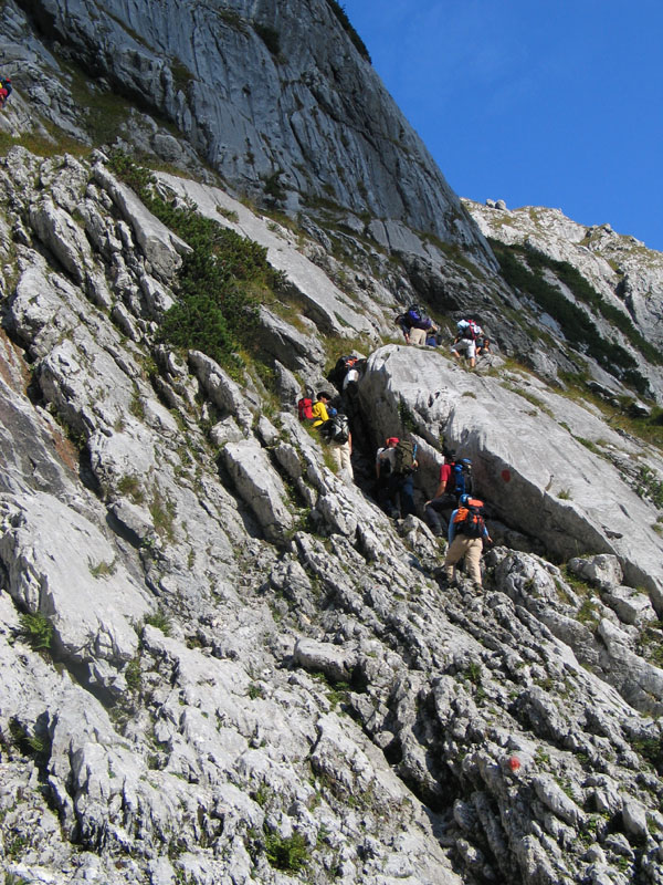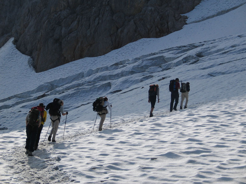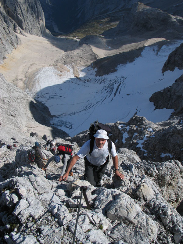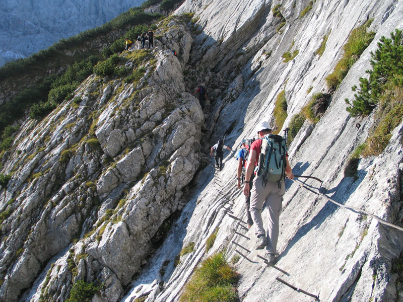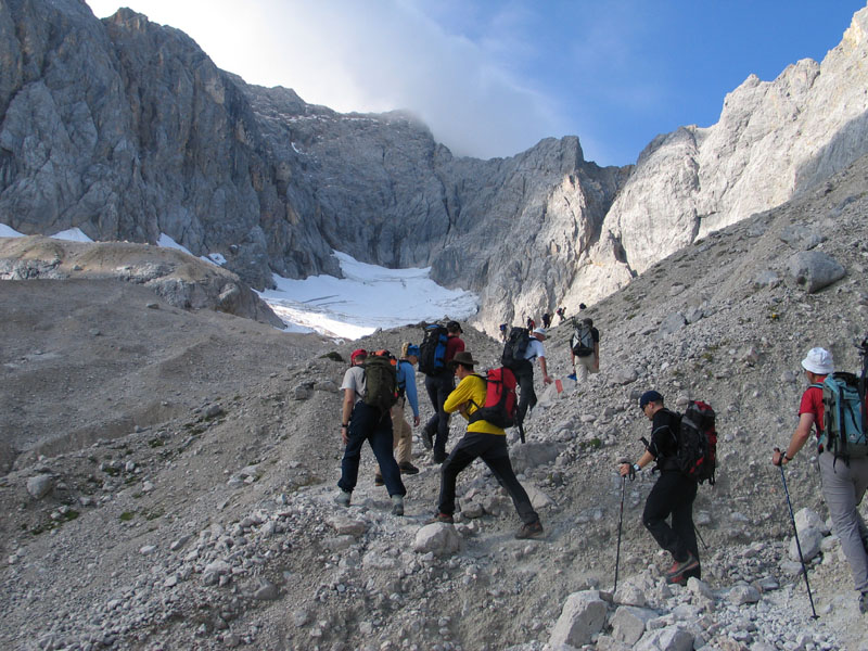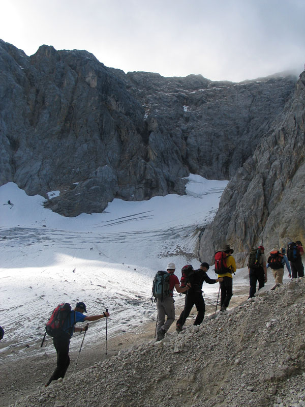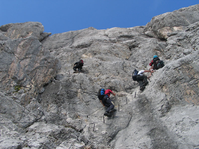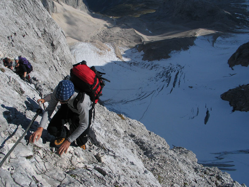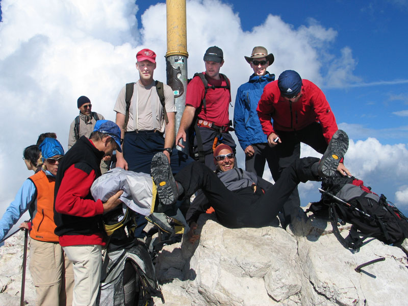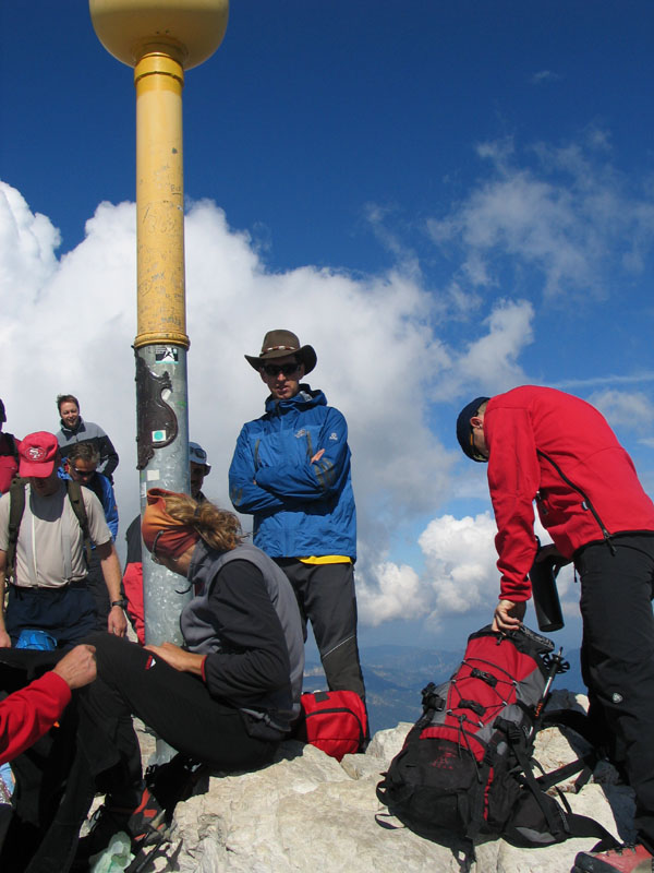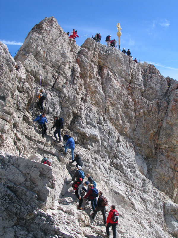 Selten aber doch geschehen Zeichen und Wunder: So kam es, dass uns die Meteorologen zu unserer Gemeinschaftstour schönes Wetter vorhergesagt hatten und das dann auch wirklich eintrat. Zwölf Teilnehmer genossen einen Aufstieg über ca. 2200 Höhenmeter bei meist strahlendem Sonnenschein. Start der Tour war in Hammersbach, nahe Garmisch-Partenkirchen. Von dort ging es durch die imposante Höllentalklamm auf die Höllentalangerhütte und weiter über den Klettersteig auf den 2963m hohen Gipfel. Insgesamt gelang uns der Aufstieg in einer Zeit von rund 5 Stunden.
