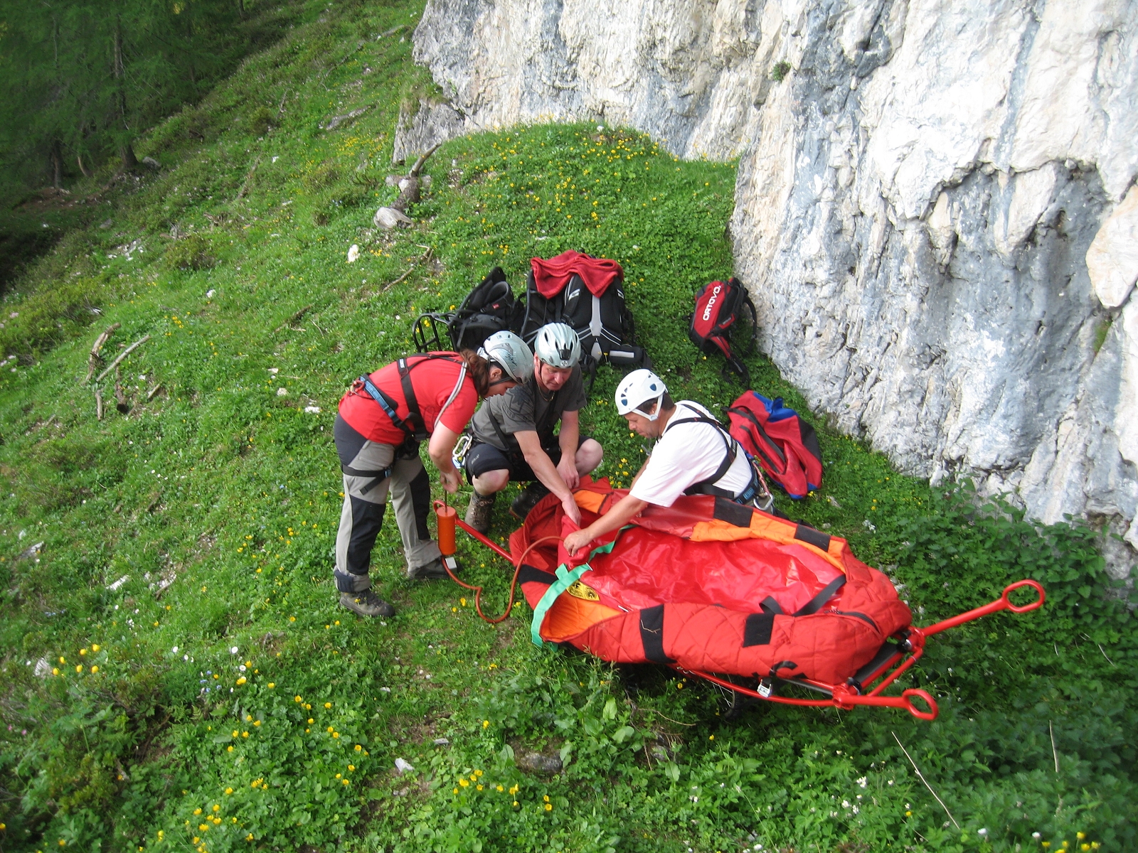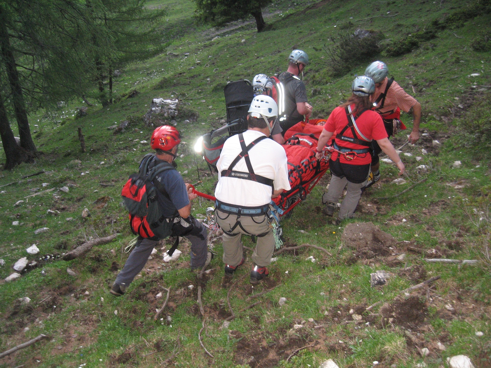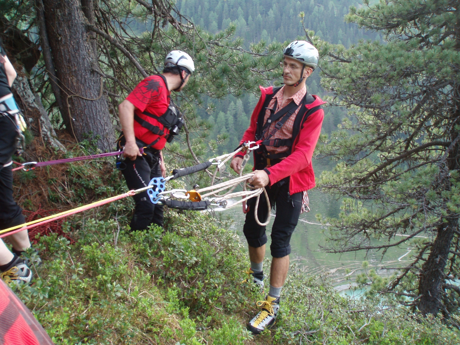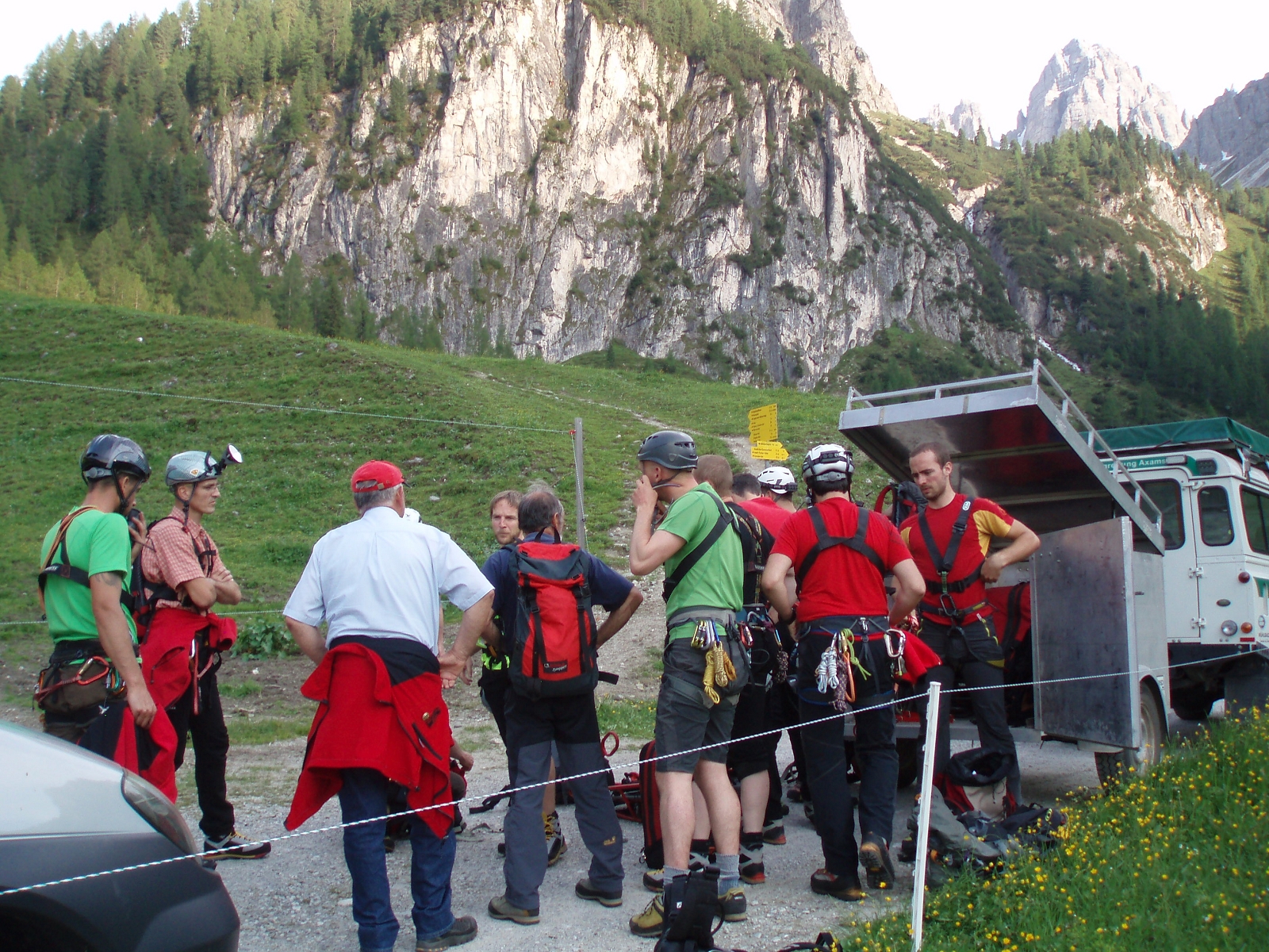 Die Mannschaft rückte mit 22 Mann und sehr viel Material in Richtung Axamer Lizum aus. Nach der ersten Einschätzung der Lage vor Ort wurde sich für eine Kapperbergung entschieden, damit der verletzte Kletterer so schnell wie möglich aus der Wand geborgen werden kann und die medizinische Erstversorgung erhält. So bildeten 6 Retter das Sanitätsteam, welches mit der benötigten Ausrüstung zum Wandfuß marschierte. Die restliche Mannschaft ging über den Halslsteig in den Bereich oberhalb der Wand zu einem geeigneten Platz für die Bergung. Am Standplatz angekommen wurde nach dem Errichten eines Seilgeländers mit dem Aufbau des Standplatzes und des Bergesystems begonnen. Auf Grund der Wandhöhe kamen zum ersten mal unsere 300m Dyneema Seile zur Anwendung. Der Retter wurde zu den Verunfallten abgelassen, er nahm den Schwerverletzten auf und wurde bis zum Wandfuß abgelassen. Unten angekommen startete die Erstversorgung des Verletzten. Der Retter hing sein Rettungsset aus und die Dyneema Seile wurden wieder hochgezogen damit ein weiterer Retter den leicht verletzten Kletterpartner bergen konnte. In der Zwischenzeit wurde der Verletzte medizinisch versorgt und mittels Gebirgstrage abtransportiert. Nach Abbau des Rettungssystems und Rückmarsch zum Auto gab es noch eine kurze Einsatzbesprechung vor Ort.
