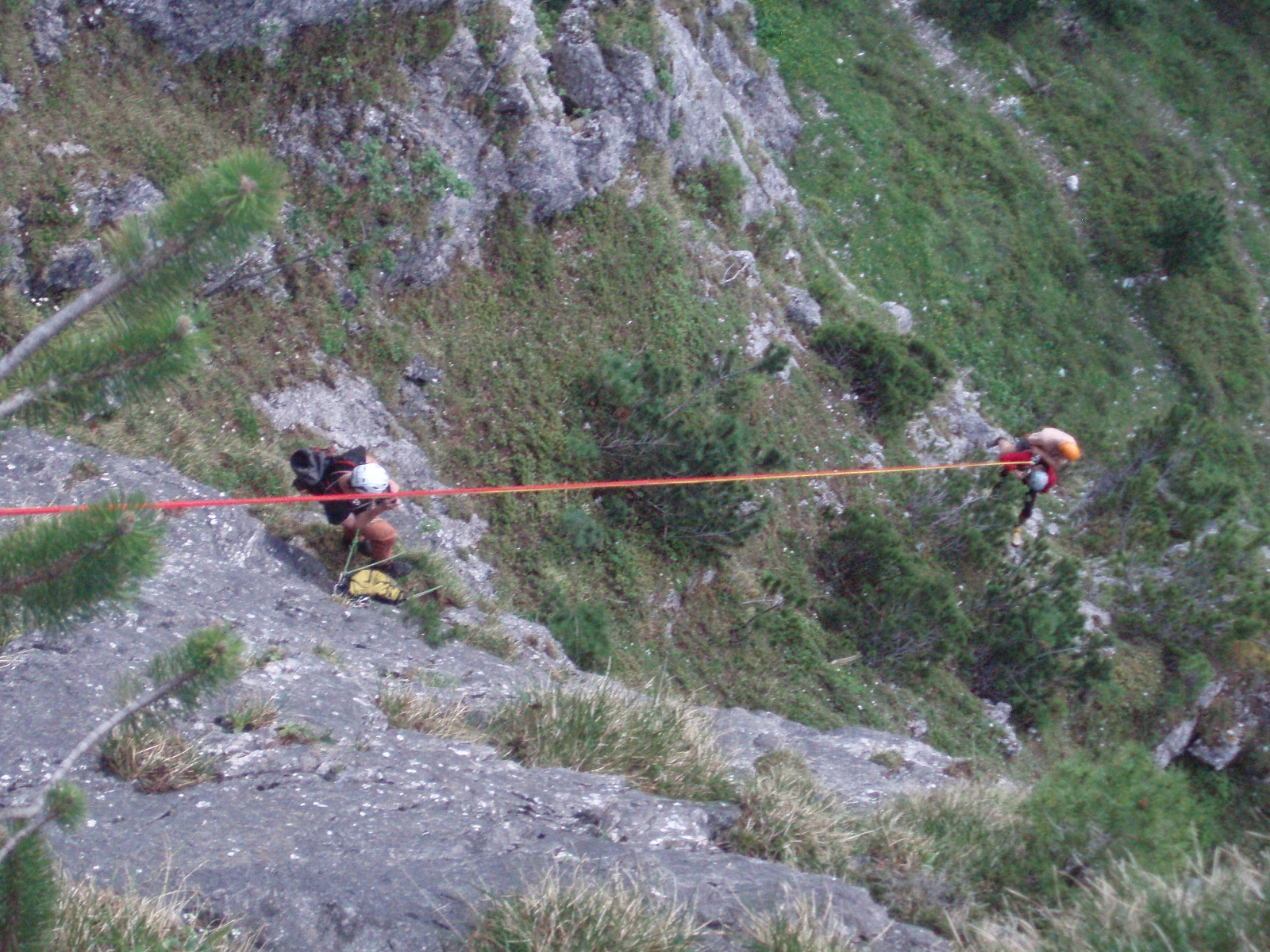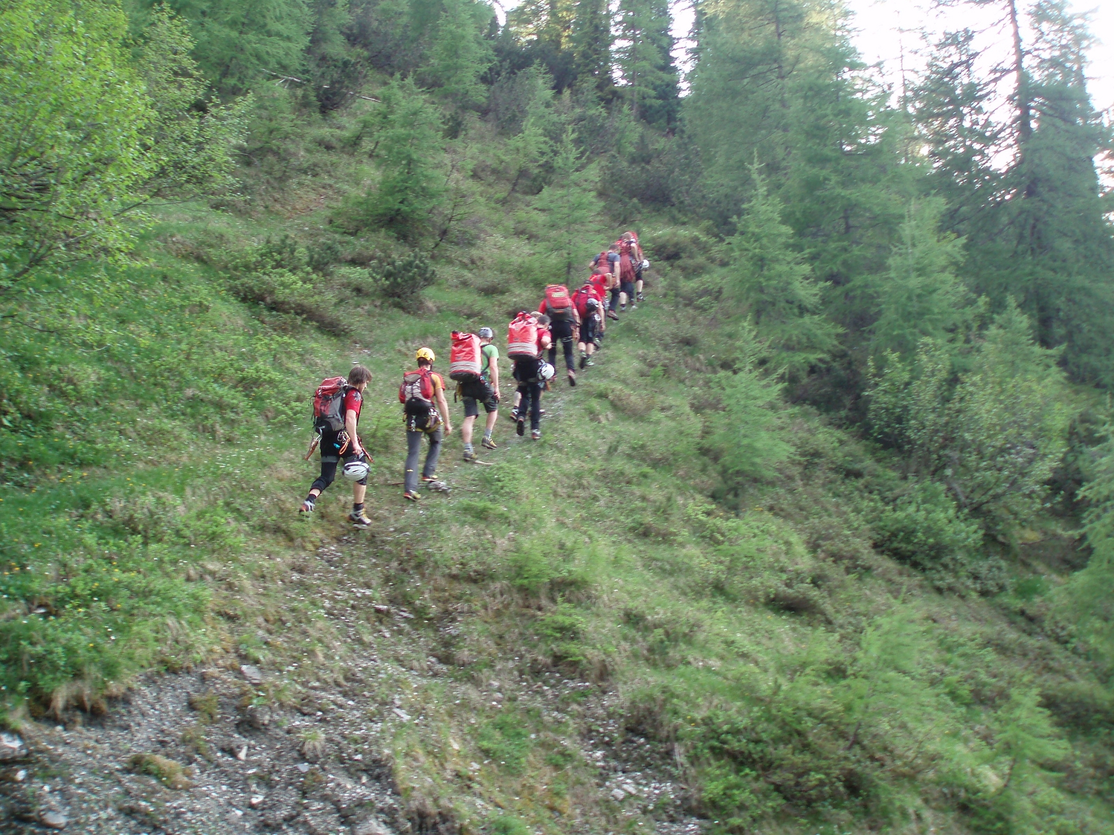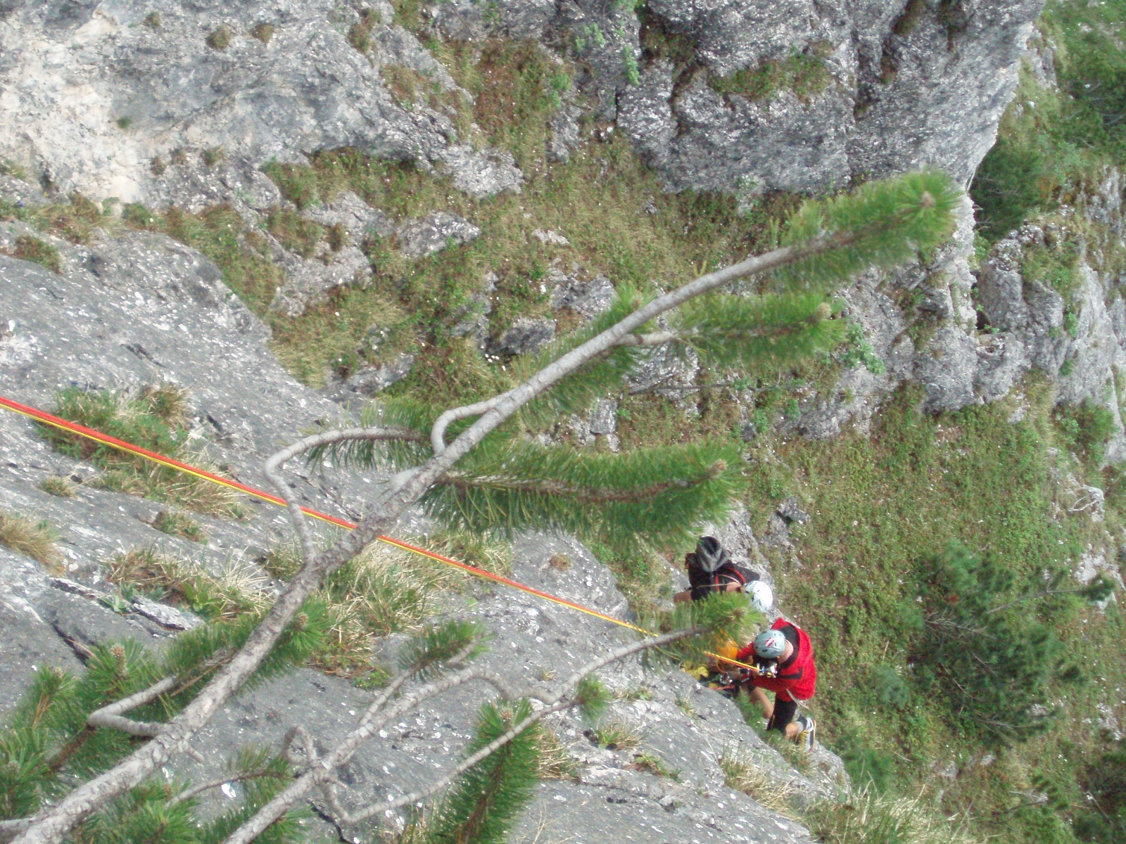 Die Mannschaft rückte mit 22 Mann und sehr viel Material in Richtung Axamer Lizum aus. Nach der ersten Einschätzung der Lage vor Ort wurde sich für eine Kapperbergung entschieden, damit der verletzte Kletterer so schnell wie möglich aus der Wand geborgen werden kann und die medizinische Erstversorgung erhält. So bildeten 6 Retter das Sanitätsteam, welches mit der benötigten Ausrüstung zum Wandfuß marschierte. Die restliche Mannschaft ging über den Halslsteig in den Bereich oberhalb der Wand zu einem geeigneten Platz für die Bergung. Am Standplatz angekommen wurde nach dem Errichten eines Seilgeländers mit dem Aufbau des Standplatzes und des Bergesystems begonnen. Auf Grund der Wandhöhe kamen zum ersten mal unsere 300m Dyneema Seile zur Anwendung. Der Retter wurde zu den Verunfallten abgelassen, er nahm den Schwerverletzten auf und wurde bis zum Wandfuß abgelassen. Unten angekommen startete die Erstversorgung des Verletzten. Der Retter hing sein Rettungsset aus und die Dyneema Seile wurden wieder hochgezogen damit ein weiterer Retter den leicht verletzten Kletterpartner bergen konnte. In der Zwischenzeit wurde der Verletzte medizinisch versorgt und mittels Gebirgstrage abtransportiert. Nach Abbau des Rettungssystems und Rückmarsch zum Auto gab es noch eine kurze Einsatzbesprechung vor Ort.