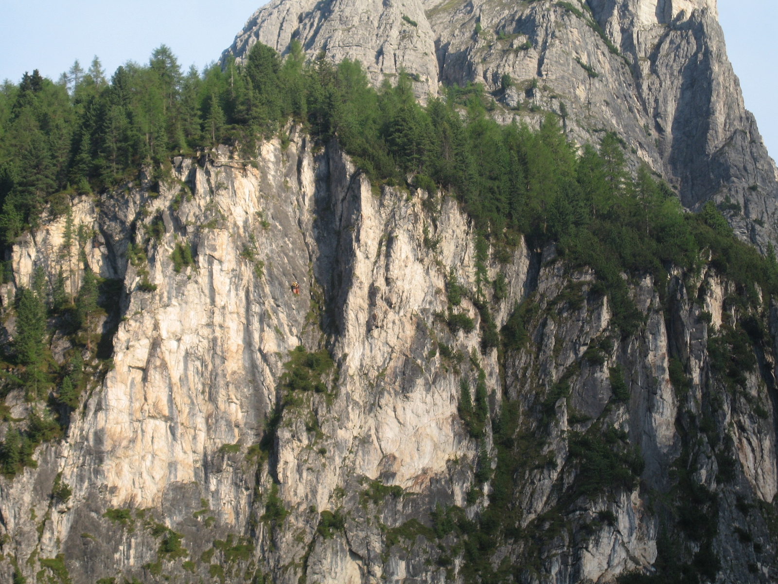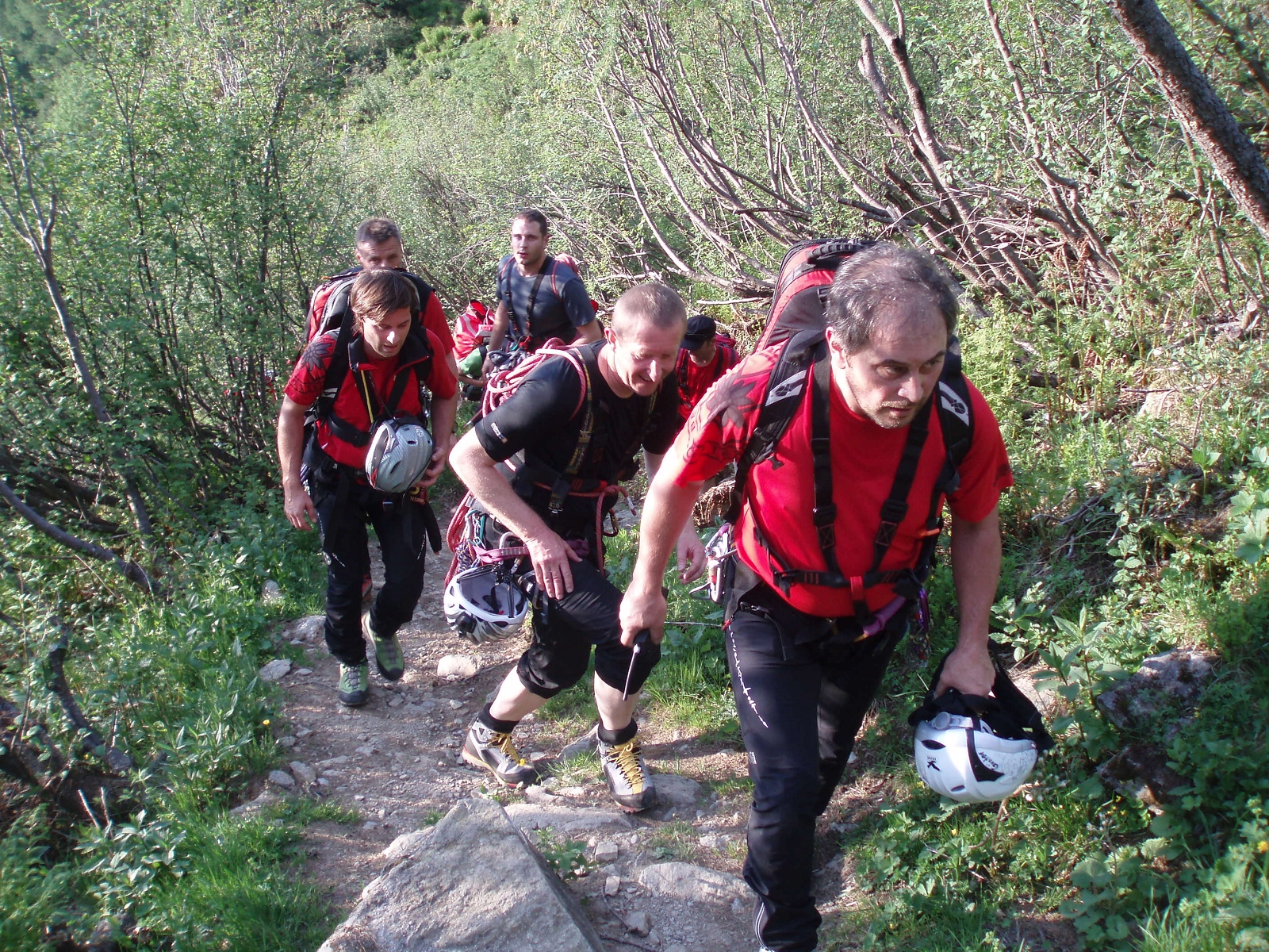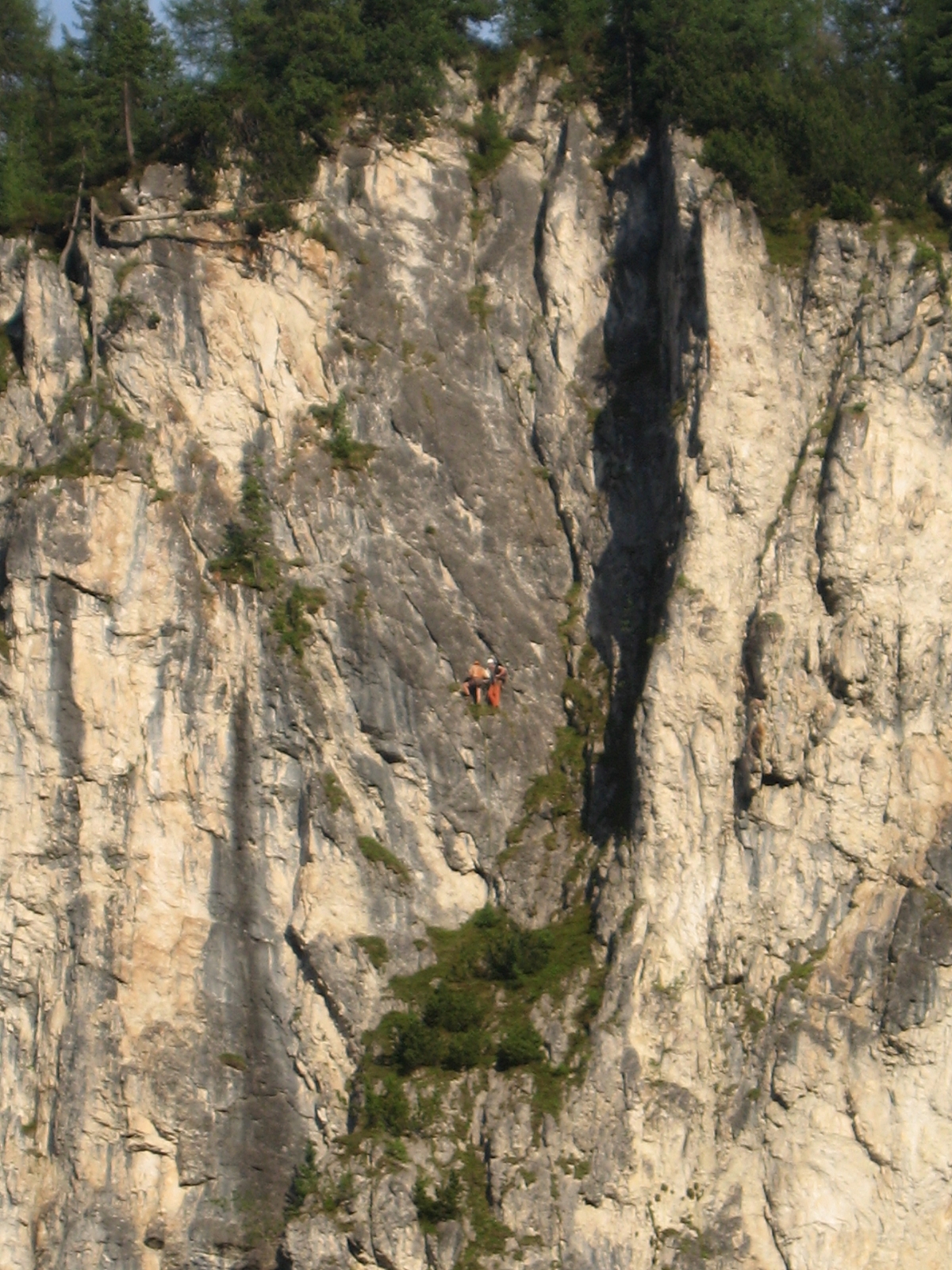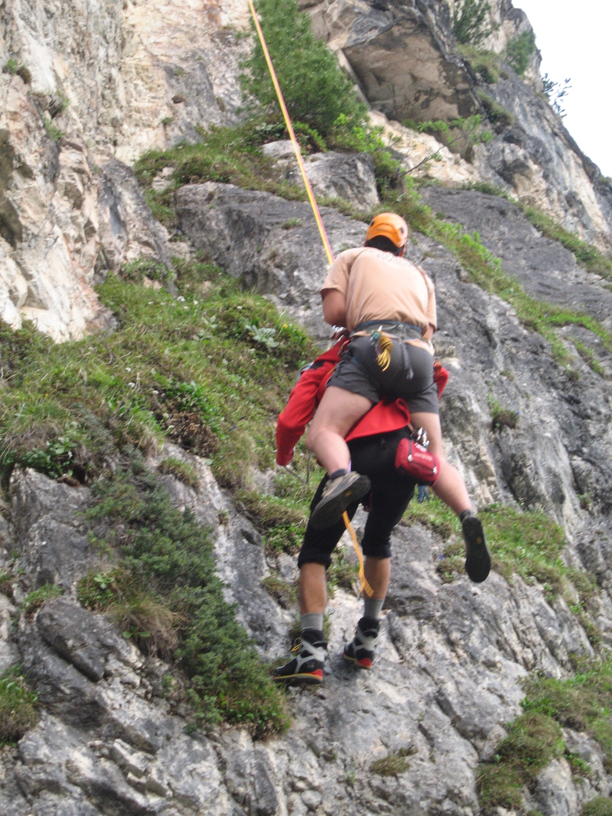 Die Mannschaft rückte mit 22 Mann und sehr viel Material in Richtung Axamer Lizum aus. Nach der ersten Einschätzung der Lage vor Ort wurde sich für eine Kapperbergung entschieden, damit der verletzte Kletterer so schnell wie möglich aus der Wand geborgen werden kann und die medizinische Erstversorgung erhält. So bildeten 6 Retter das Sanitätsteam, welches mit der benötigten Ausrüstung zum Wandfuß marschierte. Die restliche Mannschaft ging über den Halslsteig in den Bereich oberhalb der Wand zu einem geeigneten Platz für die Bergung. Am Standplatz angekommen wurde nach dem Errichten eines Seilgeländers mit dem Aufbau des Standplatzes und des Bergesystems begonnen. Auf Grund der Wandhöhe kamen zum ersten mal unsere 300m Dyneema Seile zur Anwendung. Der Retter wurde zu den Verunfallten abgelassen, er nahm den Schwerverletzten auf und wurde bis zum Wandfuß abgelassen. Unten angekommen startete die Erstversorgung des Verletzten. Der Retter hing sein Rettungsset aus und die Dyneema Seile wurden wieder hochgezogen damit ein weiterer Retter den leicht verletzten Kletterpartner bergen konnte. In der Zwischenzeit wurde der Verletzte medizinisch versorgt und mittels Gebirgstrage abtransportiert. Nach Abbau des Rettungssystems und Rückmarsch zum Auto gab es noch eine kurze Einsatzbesprechung vor Ort.