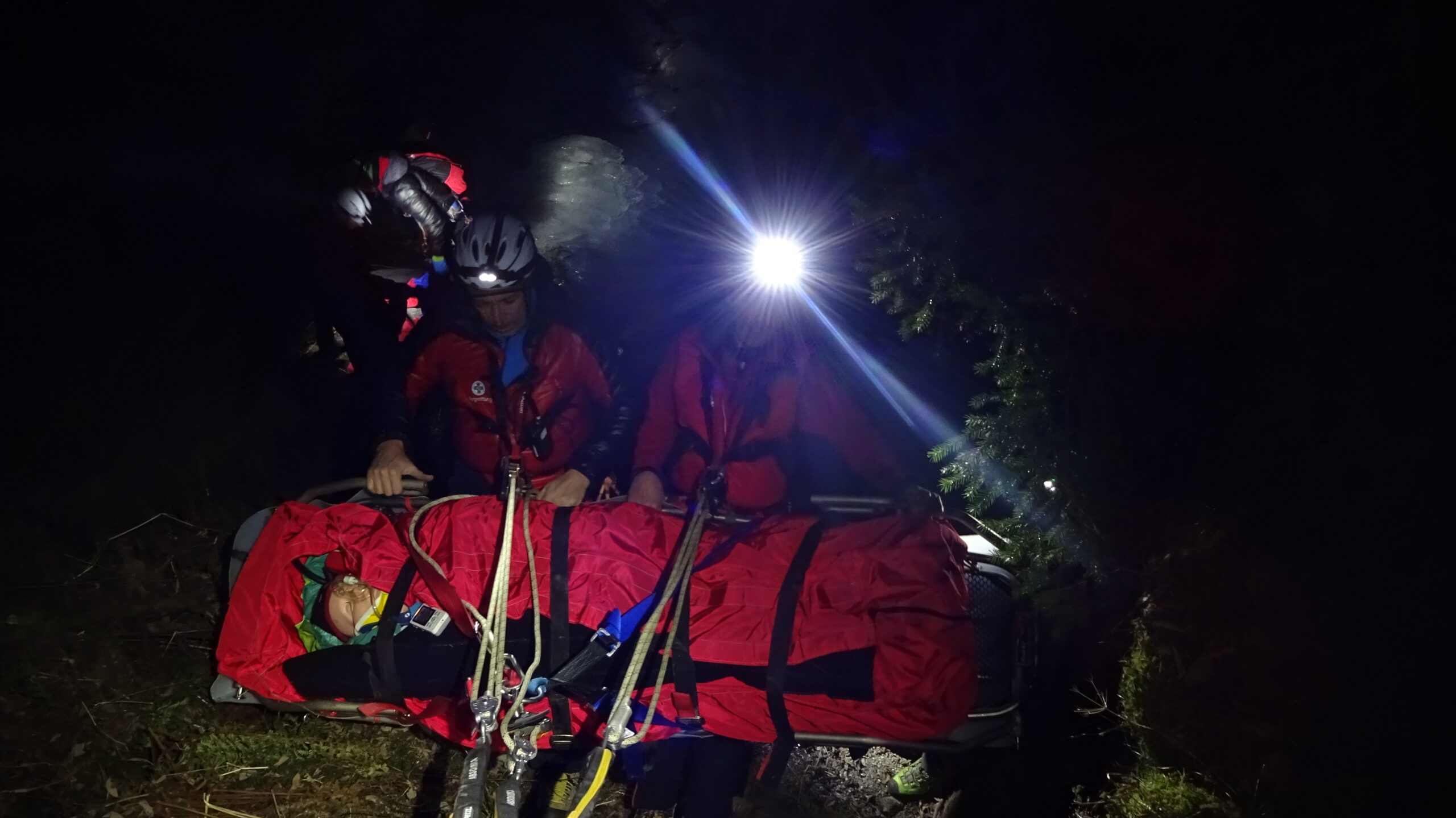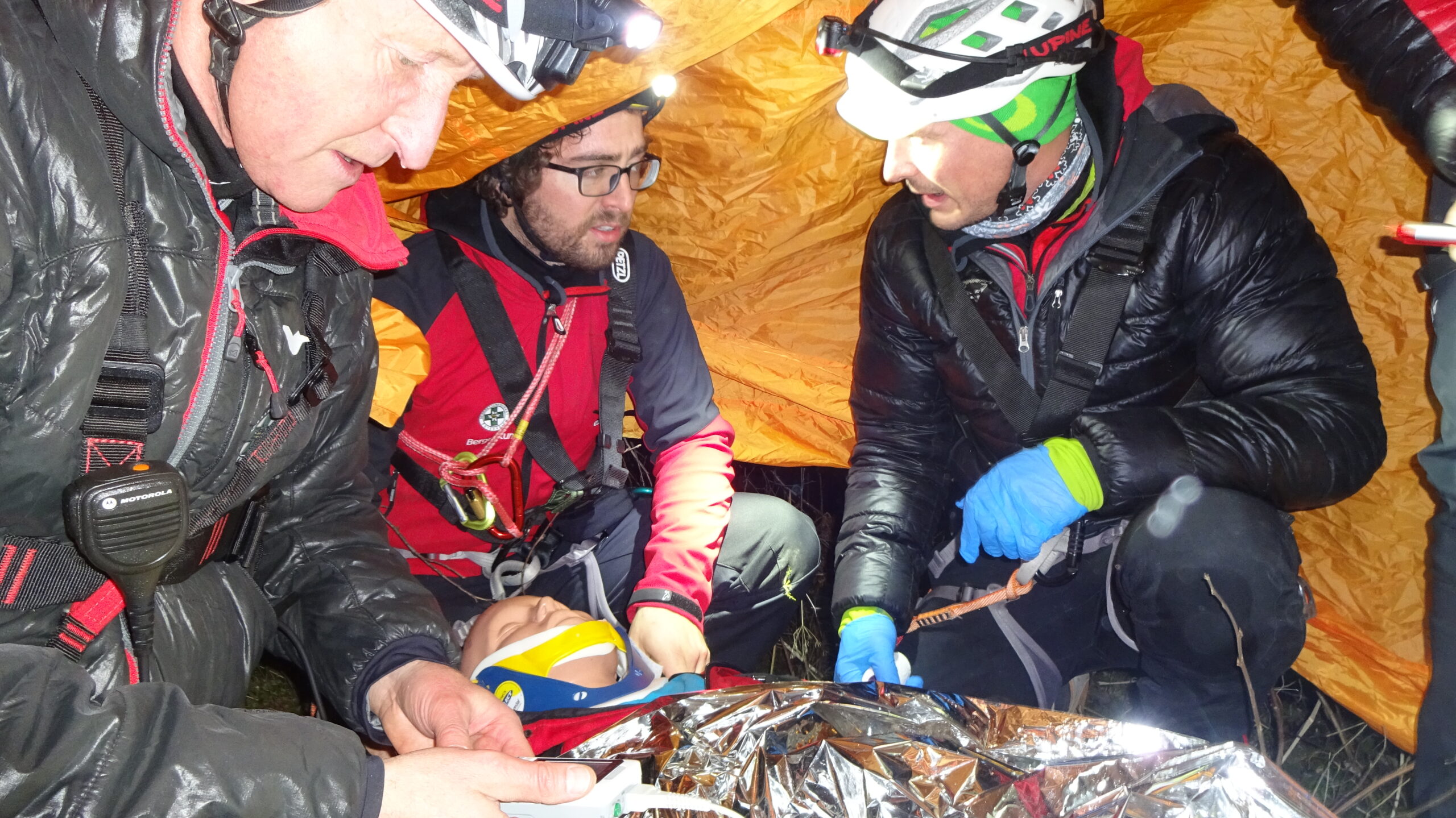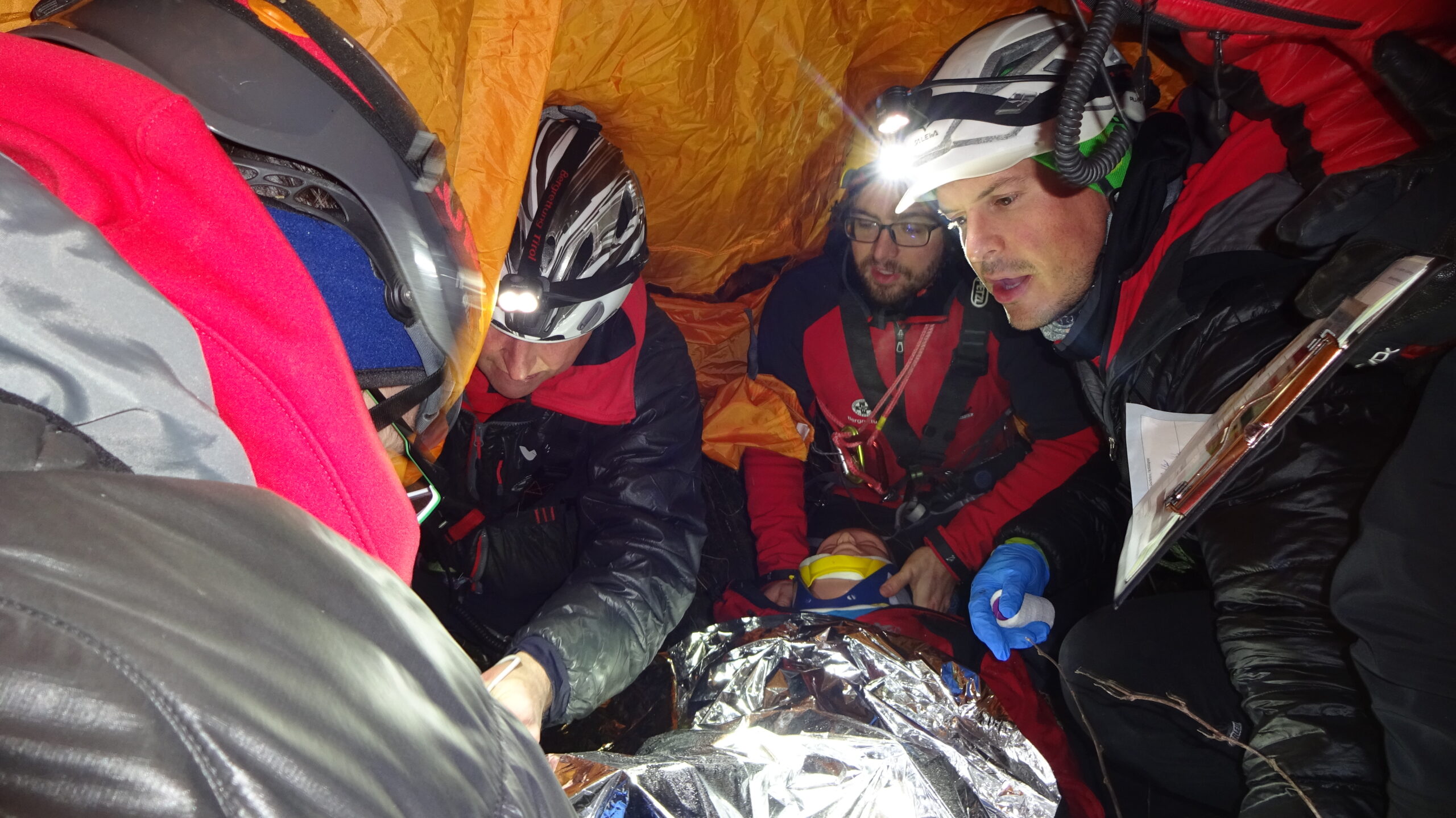 Ein voll motiviertes Team startete im vollbesetzten Einsatzauto ins Axamer Tal. Im unteren Teil, bei einer Staumauer des Axamer Baches, fanden wir den Melder auf, der uns den Verunfallten im Bachbett liegend zeigte. Schnell war ein Voraustrupp beim Patienten, barg ihn aus dem Gefahrenbereich und versorgte ihn mit dem neuen Wärmemanagement. Herzstück des Wärmemanagements ist ein 12-Mann-Biwakzelt, das man schnell über den Verletzten und ein paar Bergrettern ziehen kann, womit man speziell bei widrigen Wetterbedingungen eine für den Patienten angenehmere Atmosphäre schafft.