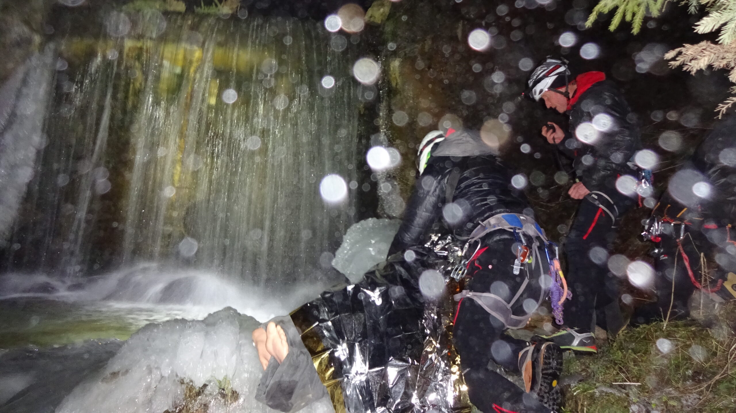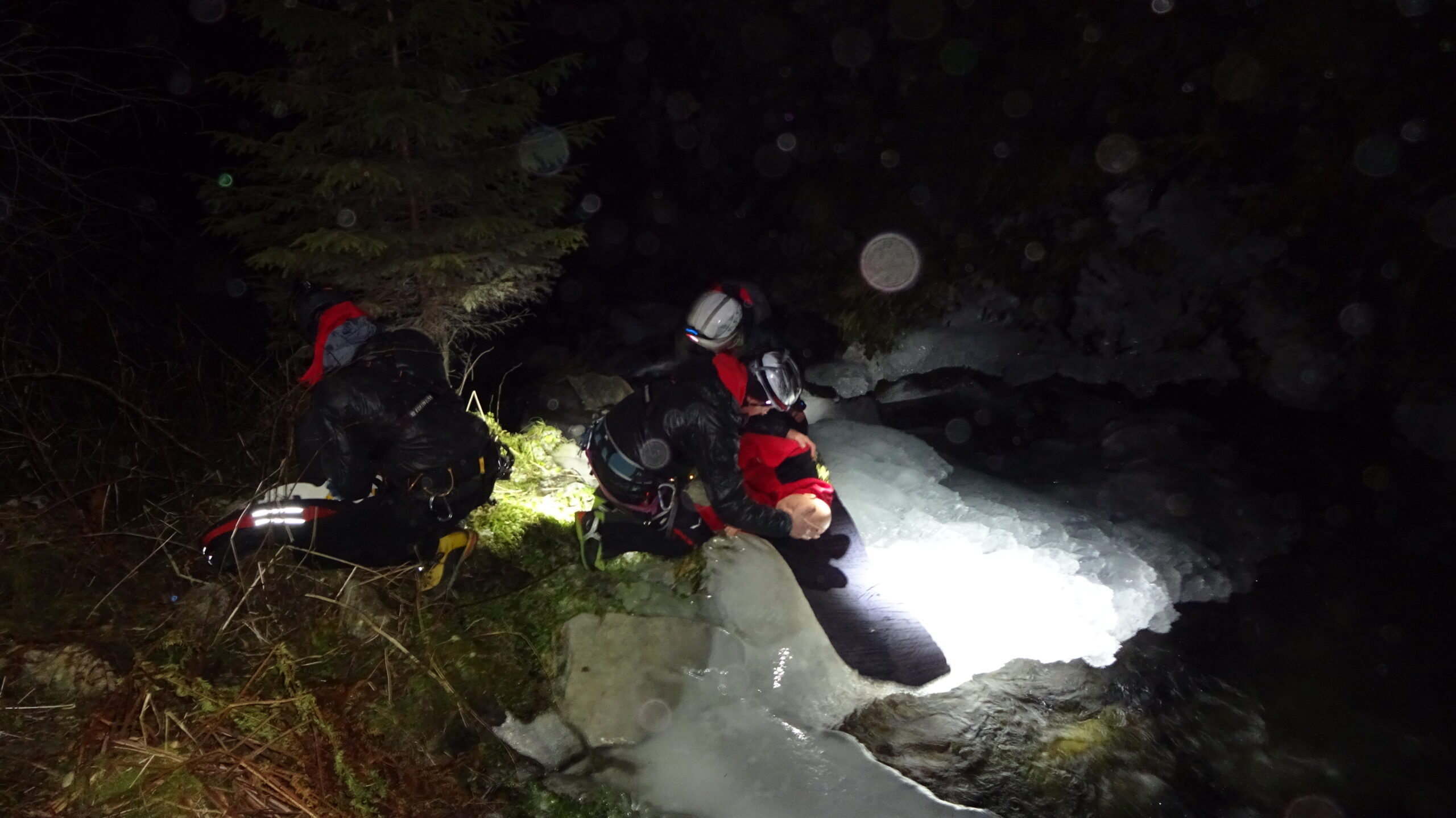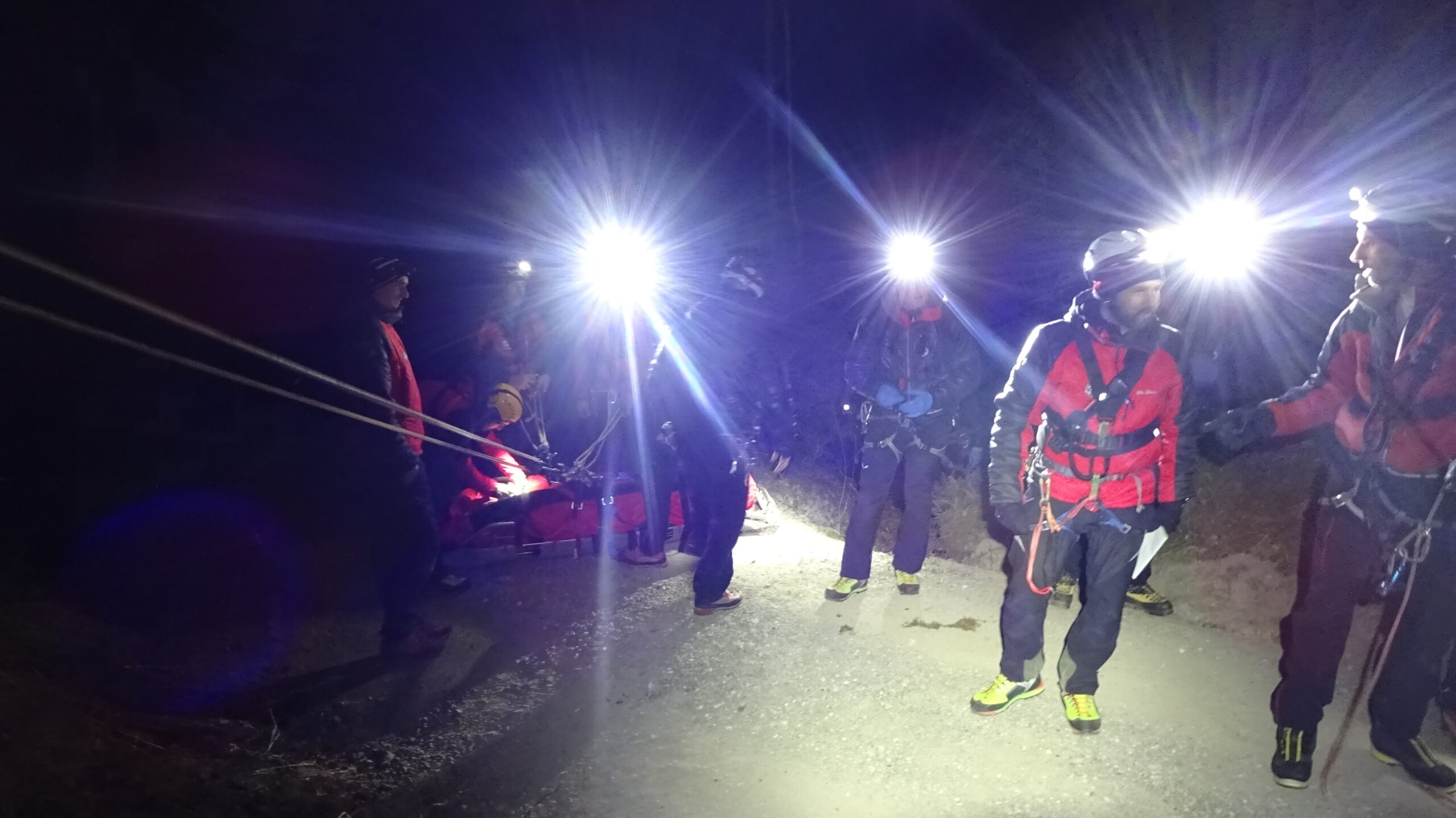 Ein voll motiviertes Team startete im vollbesetzten Einsatzauto ins Axamer Tal. Im unteren Teil, bei einer Staumauer des Axamer Baches, fanden wir den Melder auf, der uns den Verunfallten im Bachbett liegend zeigte. Schnell war ein Voraustrupp beim Patienten, barg ihn aus dem Gefahrenbereich und versorgte ihn mit dem neuen Wärmemanagement. Herzstück des Wärmemanagements ist ein 12-Mann-Biwakzelt, das man schnell über den Verletzten und ein paar Bergrettern ziehen kann, womit man speziell bei widrigen Wetterbedingungen eine für den Patienten angenehmere Atmosphäre schafft.