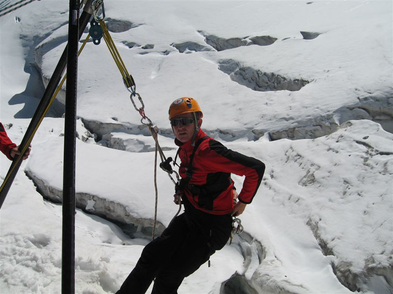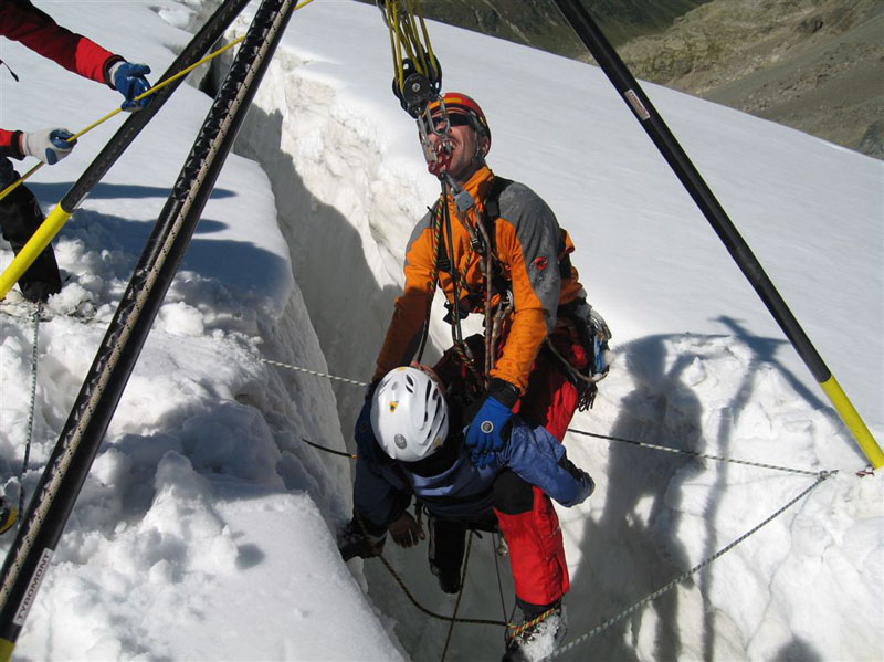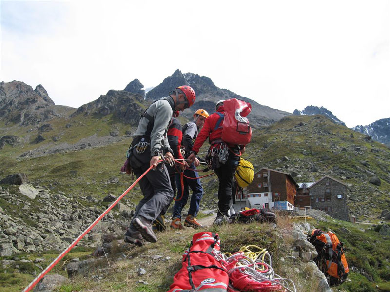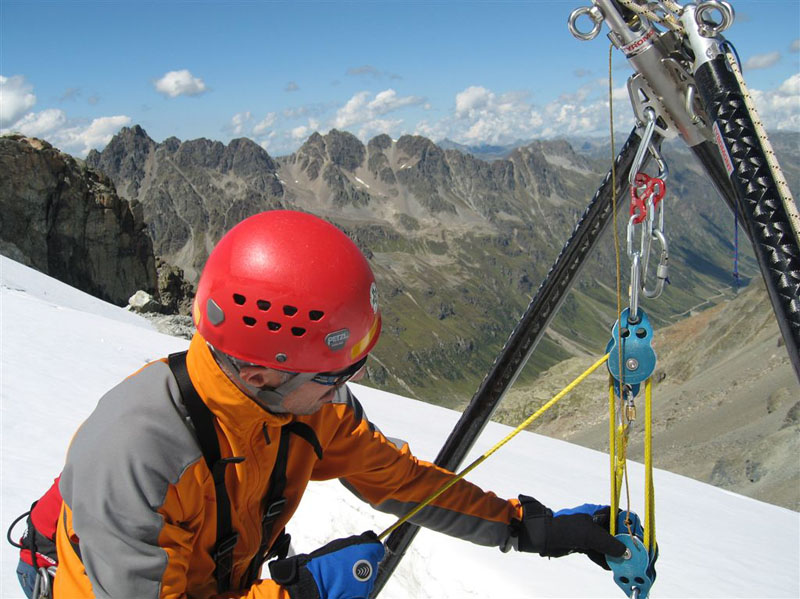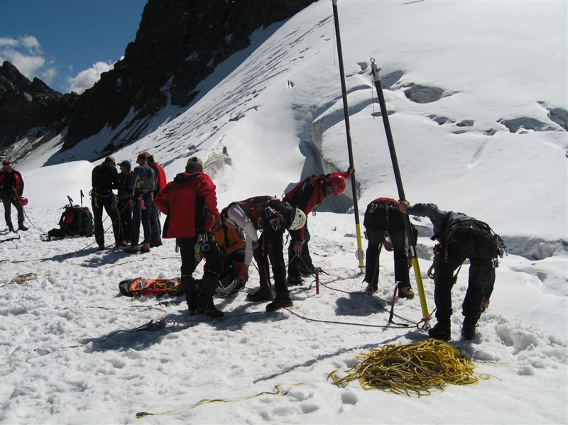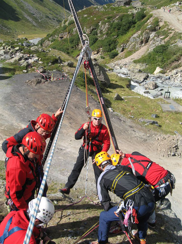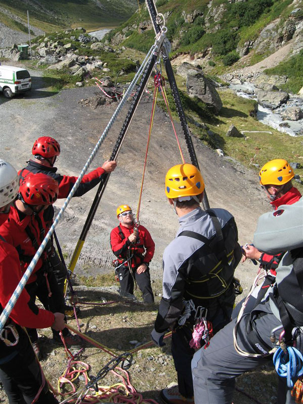 Am Samstag ging es bei Traumwetter auf den Chalausferner wo auf fast 3000 m neben den herkömmlichen Bergemethoden am Gletscher wie Seilrolle und Flaschenzug auch der richtige Umgang von Zweibein und Dreibein im Eis ausgiebig geübt wurde. Dabei wurde besonders auf eine optimale Redundanz bei der Bergung geachtet.