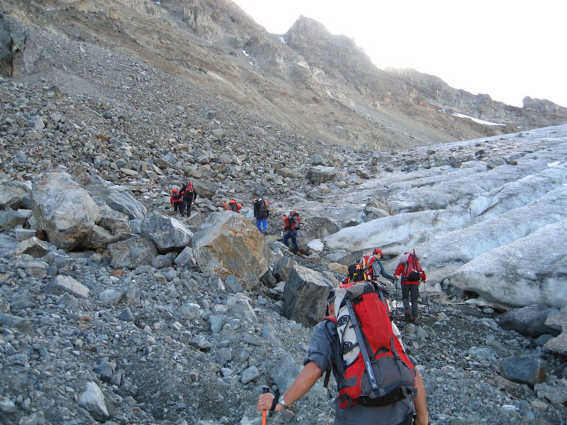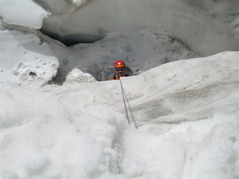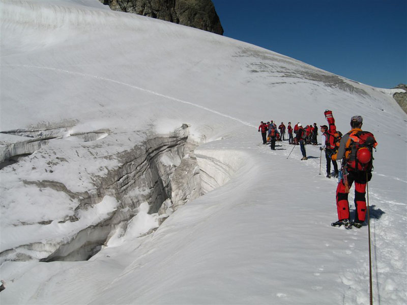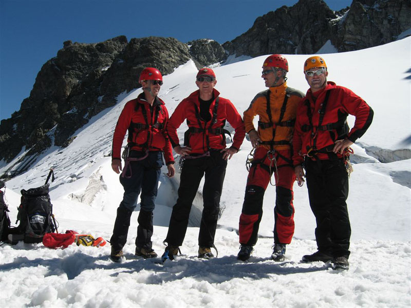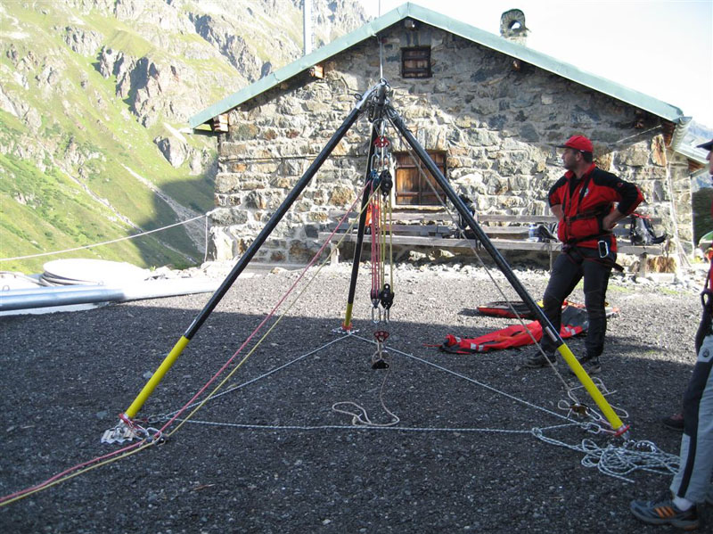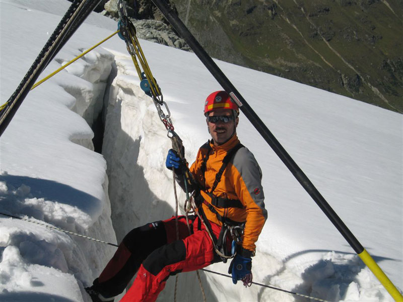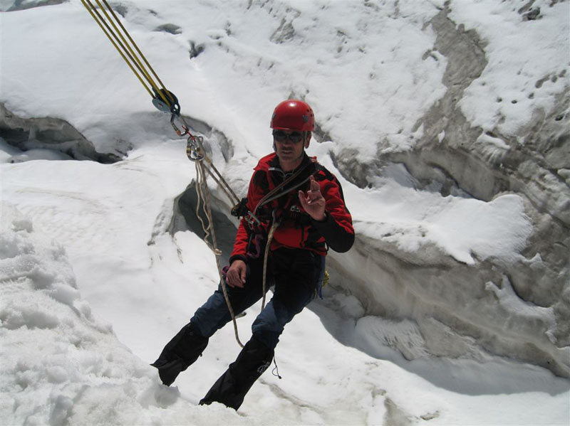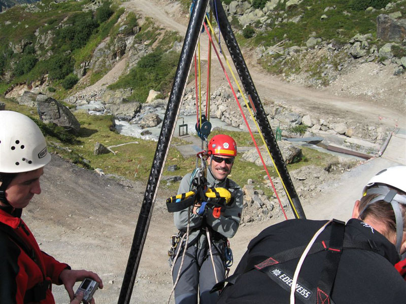 Am Samstag ging es bei Traumwetter auf den Chalausferner wo auf fast 3000 m neben den herkömmlichen Bergemethoden am Gletscher wie Seilrolle und Flaschenzug auch der richtige Umgang von Zweibein und Dreibein im Eis ausgiebig geübt wurde. Dabei wurde besonders auf eine optimale Redundanz bei der Bergung geachtet.