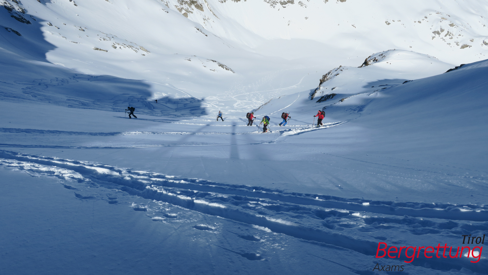 Wir starteten mit einer Aufstiegshilfe neuerster Technik, der Albonabahn II, und nach kurzer Pistenabfahrt mit einer eher in die Jahre gekommenen Aufstiegshilfe, der Albonagratbahn, auf knapp 2.400m. Fast geschockt von den Massen an Tourengehern dort starteten wir den ersten Aufstieg der Tour auf die Maroiköpfe, um dort die ersten Schwünge in sogar südseitig feinstem Pulver zu ziehen. 500hm weiter unten im Maroital hieß es dann zum zweiten Mal auffellen, unser Ziel immer im Visier, doch noch weit entfernt. Gewaltige Szenerie, tolle verschneite Landschaft, unendliche Weiten und nun doch um einiges weniger an Gleichgesinnten gings bei kitschig blauem Himmel und feinen Temperaturen flott dahin. Bei den Kaltenbergseen links abgebogen auf den Gipfelhang, meisterten wir die unzähligen Spitzkehren zum Skidepot und stiegen durch eine kurze teils seilversicherte Rinne zum Gipfel des Kaltenbergs auf 2.896 m.