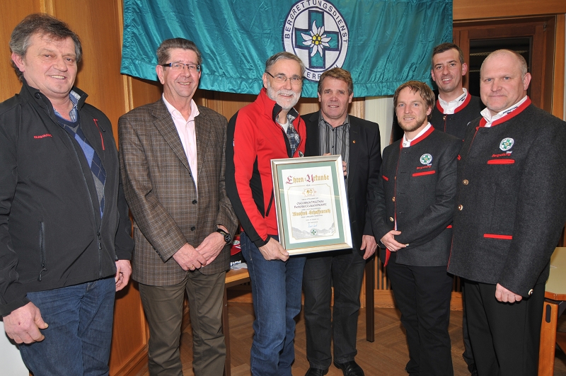 Manfred Schaffenrath wurde von der Landesleitung für 40 Jahre Mitgliedschaft in der Bergrettung mit der Ehrenurkunde ausgezeichnet.