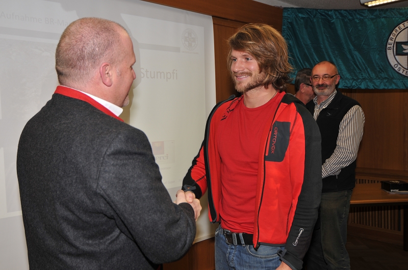 Nach Abschluss seiner mehrjährigen Ausbildung wurde Matthias (Stumpfi) Stumpf vom OSTL als neuer Bergretter aufgenommen. „Stumpfi“ wurde von seinem Kameraden lautstark gefeiert und durfte auch die zahlreichen Gratulationen der Ehrengästen entgegennehmen.