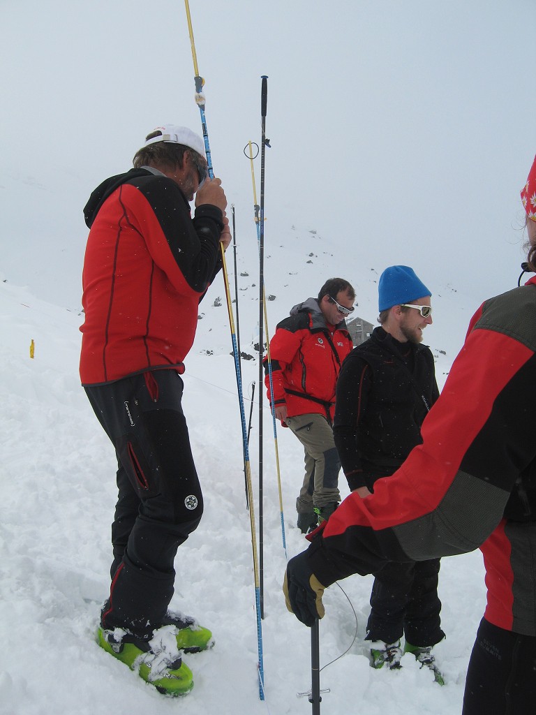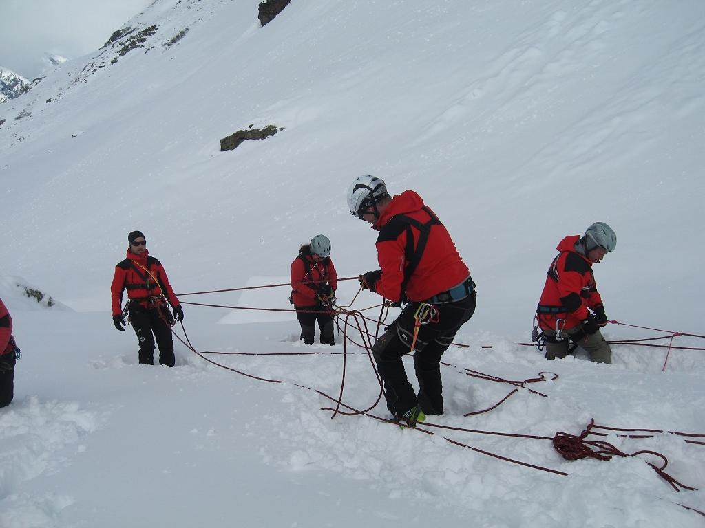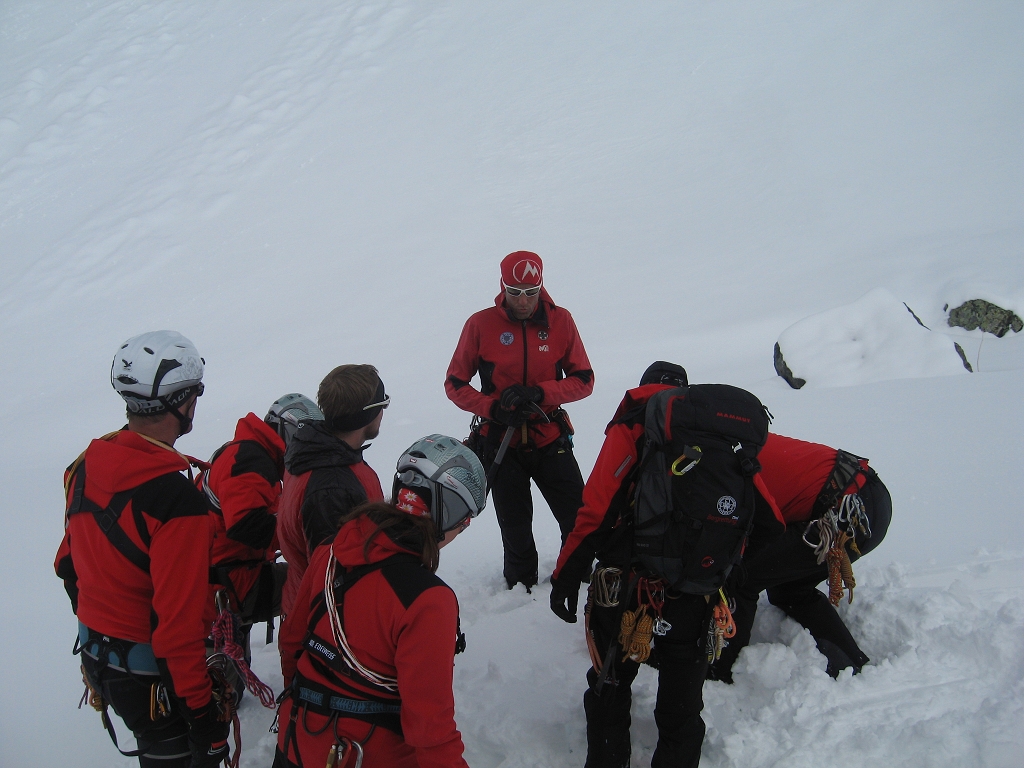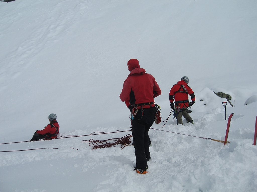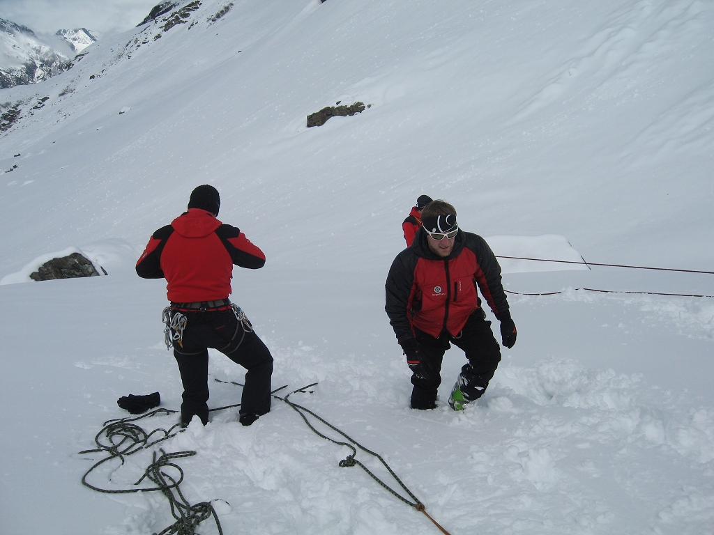Da die Lawinensituation am Samstag (Stufe 4 und 15 bis 20 cm Neuschnee in der Nacht) leider keine Schitour zuließ, wurde am Vormittag im Umfeld der Hütte die Suche mit dem LVS (Verschüttetensuchgerät), die Suche mit dem Recco und ein organisierter Lawineneinsatz mit den Bergführern des Ausbildungsteams intensiv geübt. Am Nachmittag wurden Sicherungsarten im Fels und Schnee geschult und in der Praxis ausführlich angewandt.
