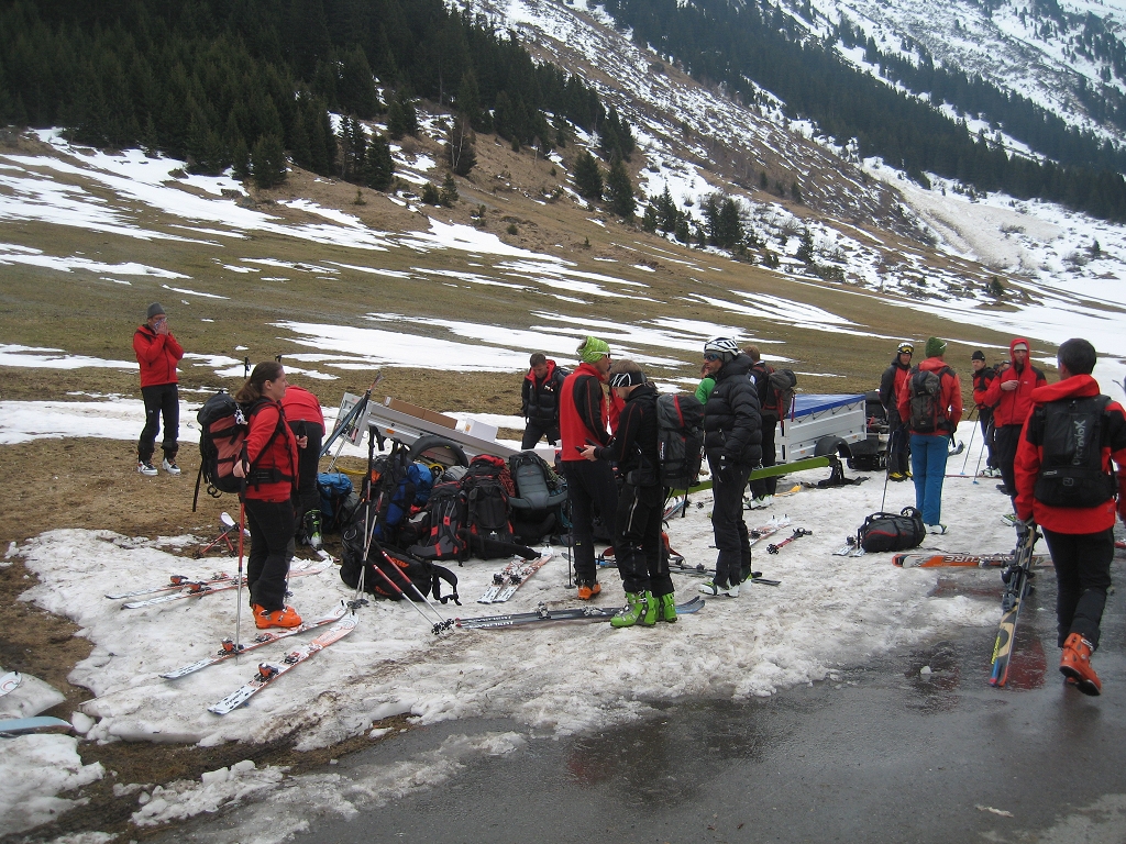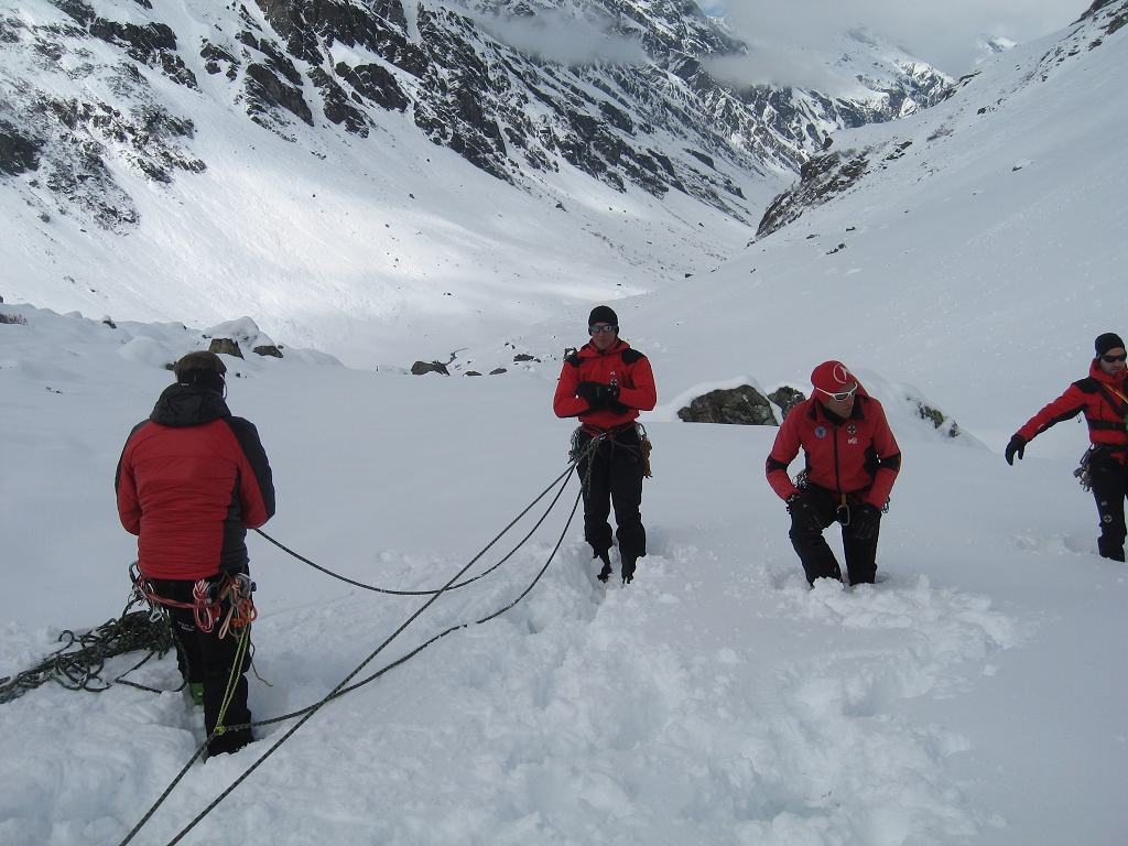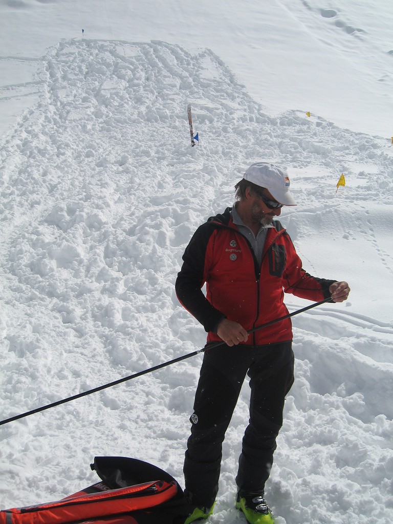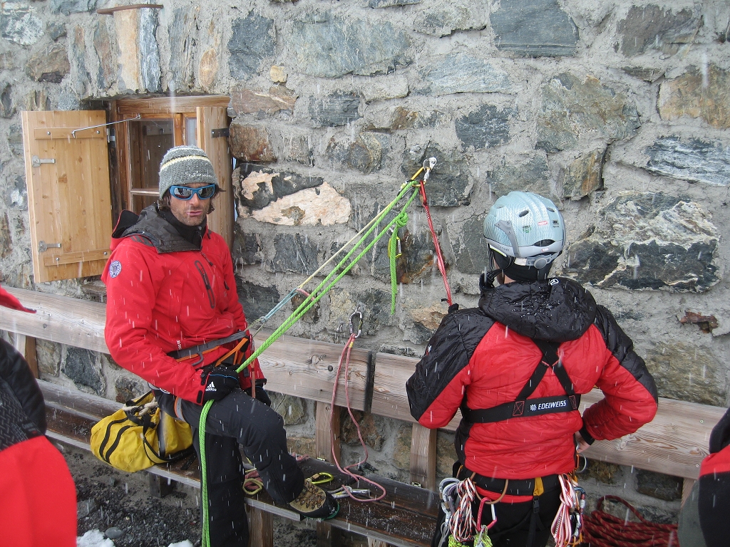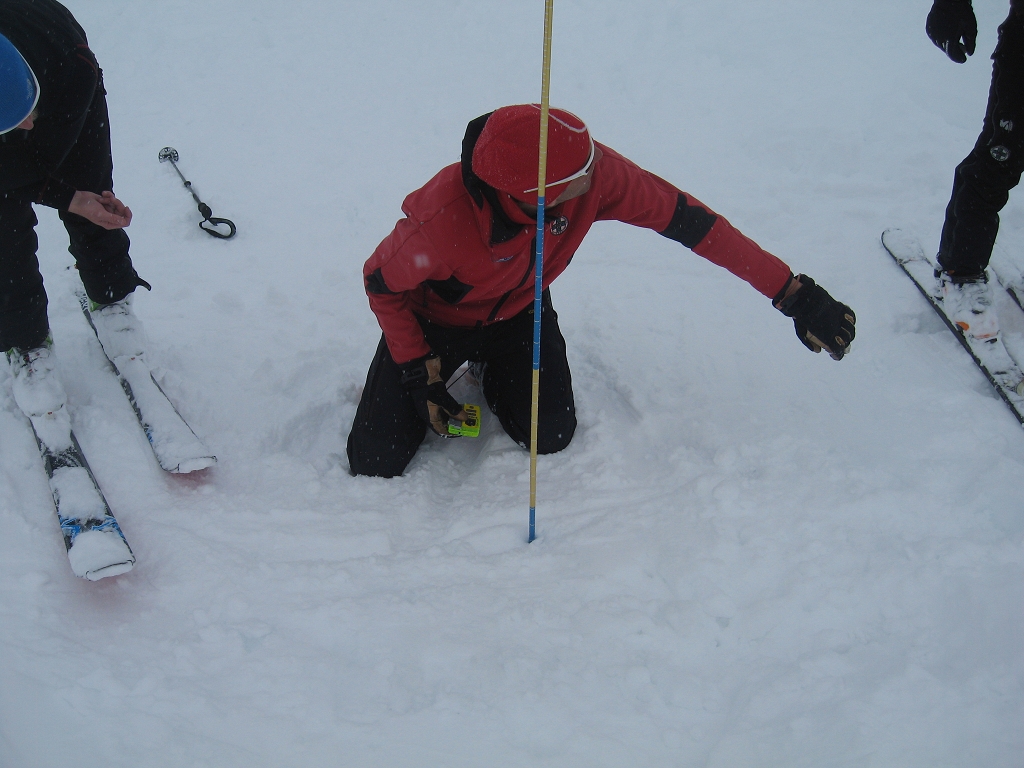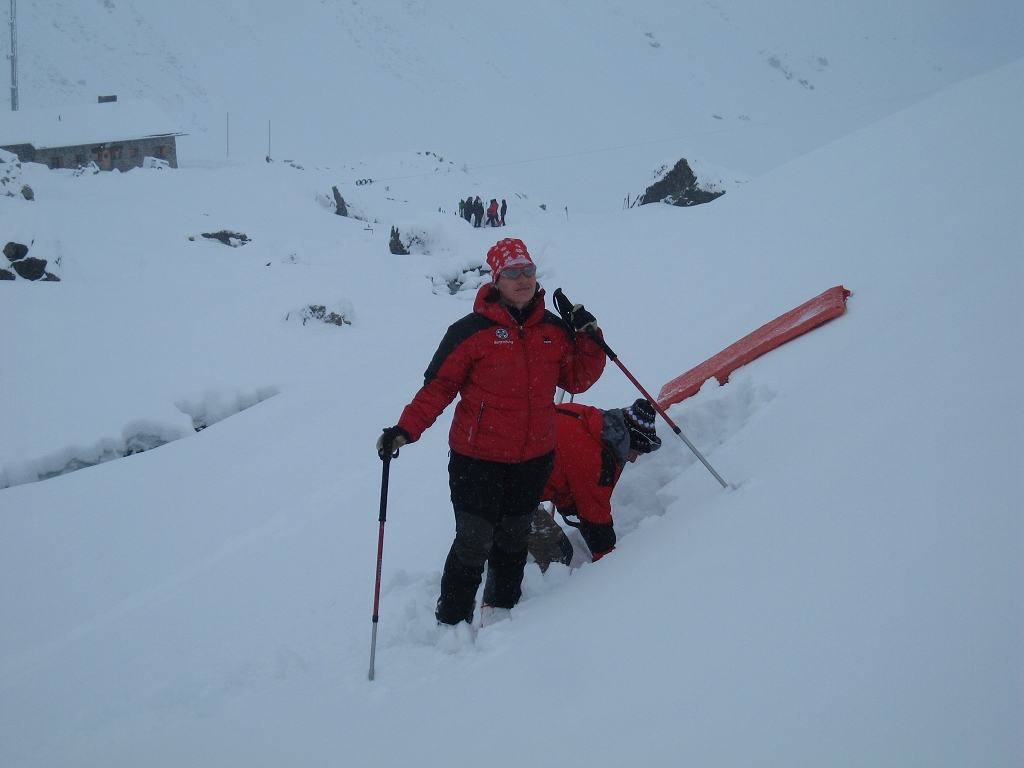 Da die Lawinensituation am Samstag (Stufe 4 und 15 bis 20 cm Neuschnee in der Nacht) leider keine Schitour zuließ, wurde am Vormittag im Umfeld der Hütte die Suche mit dem LVS (Verschüttetensuchgerät), die Suche mit dem Recco und ein organisierter Lawineneinsatz mit den Bergführern des Ausbildungsteams intensiv geübt. Am Nachmittag wurden Sicherungsarten im Fels und Schnee geschult und in der Praxis ausführlich angewandt.