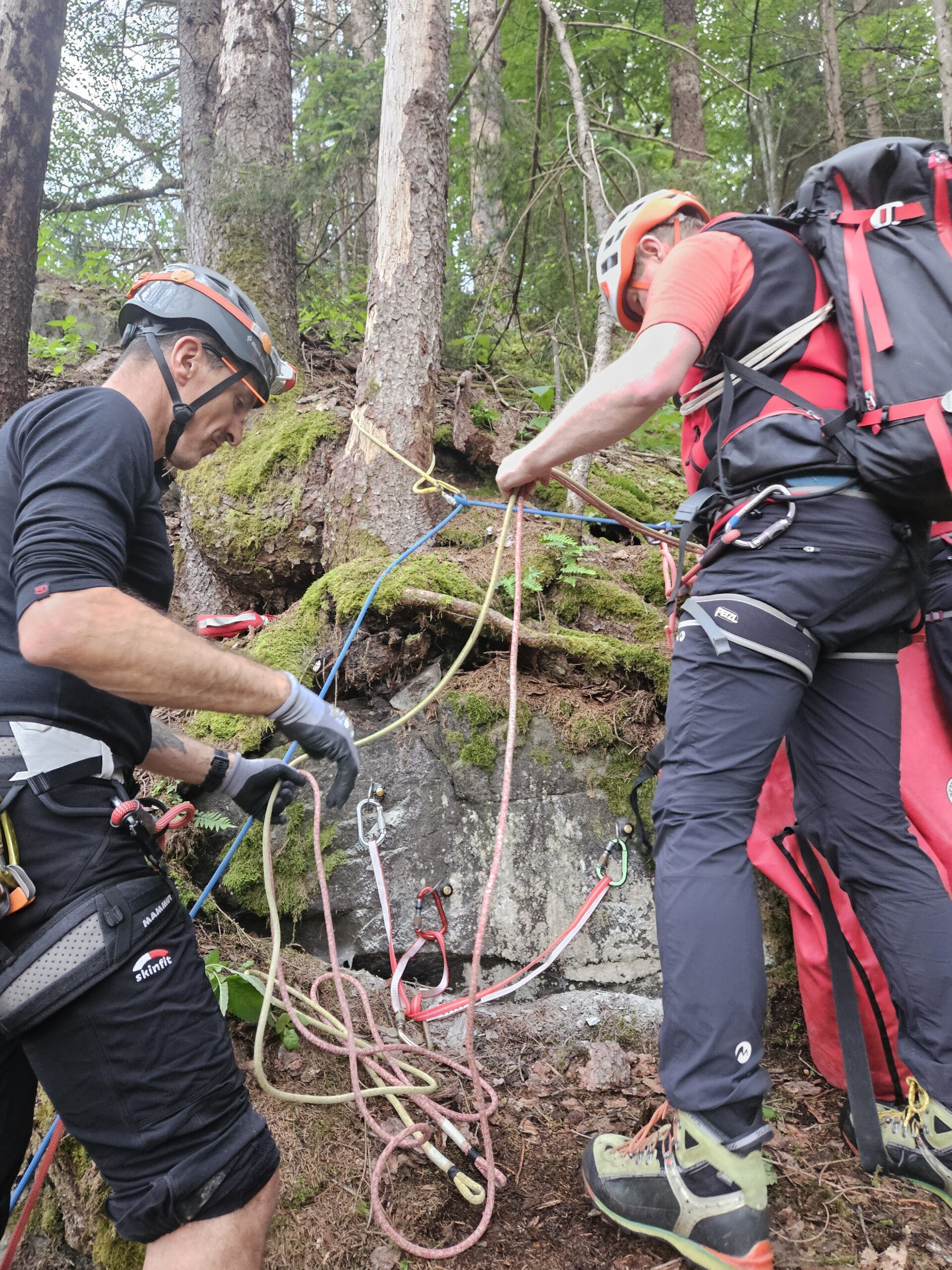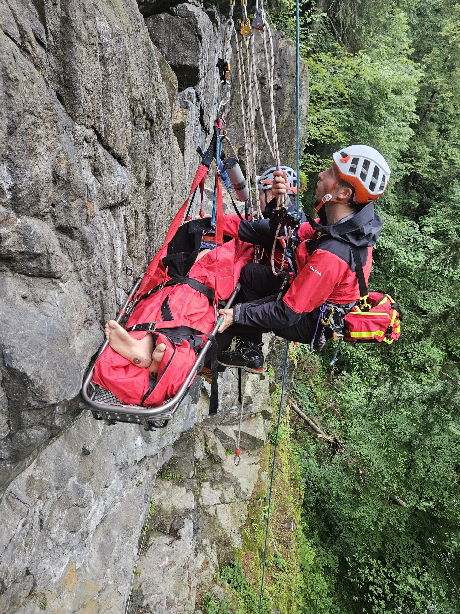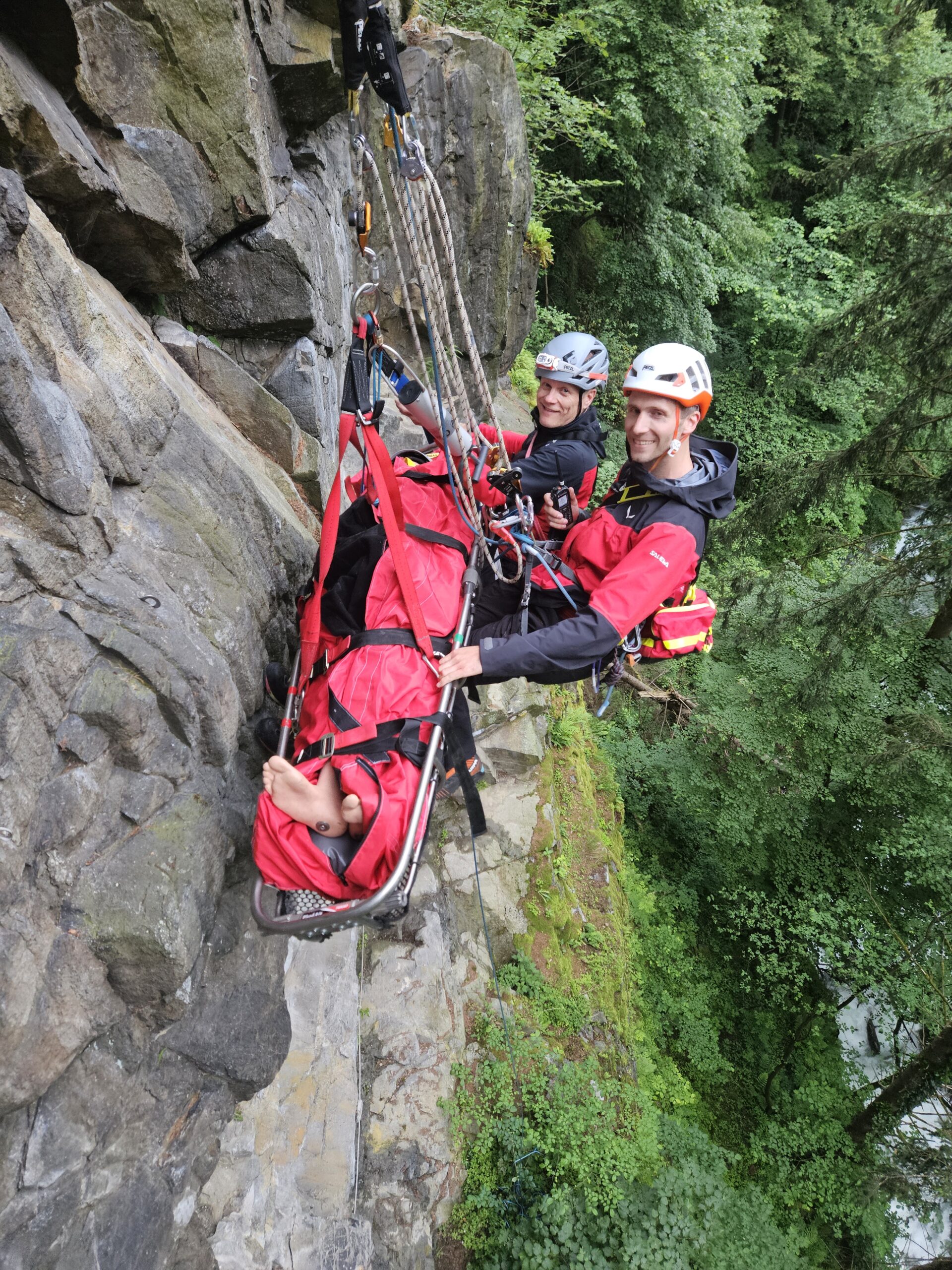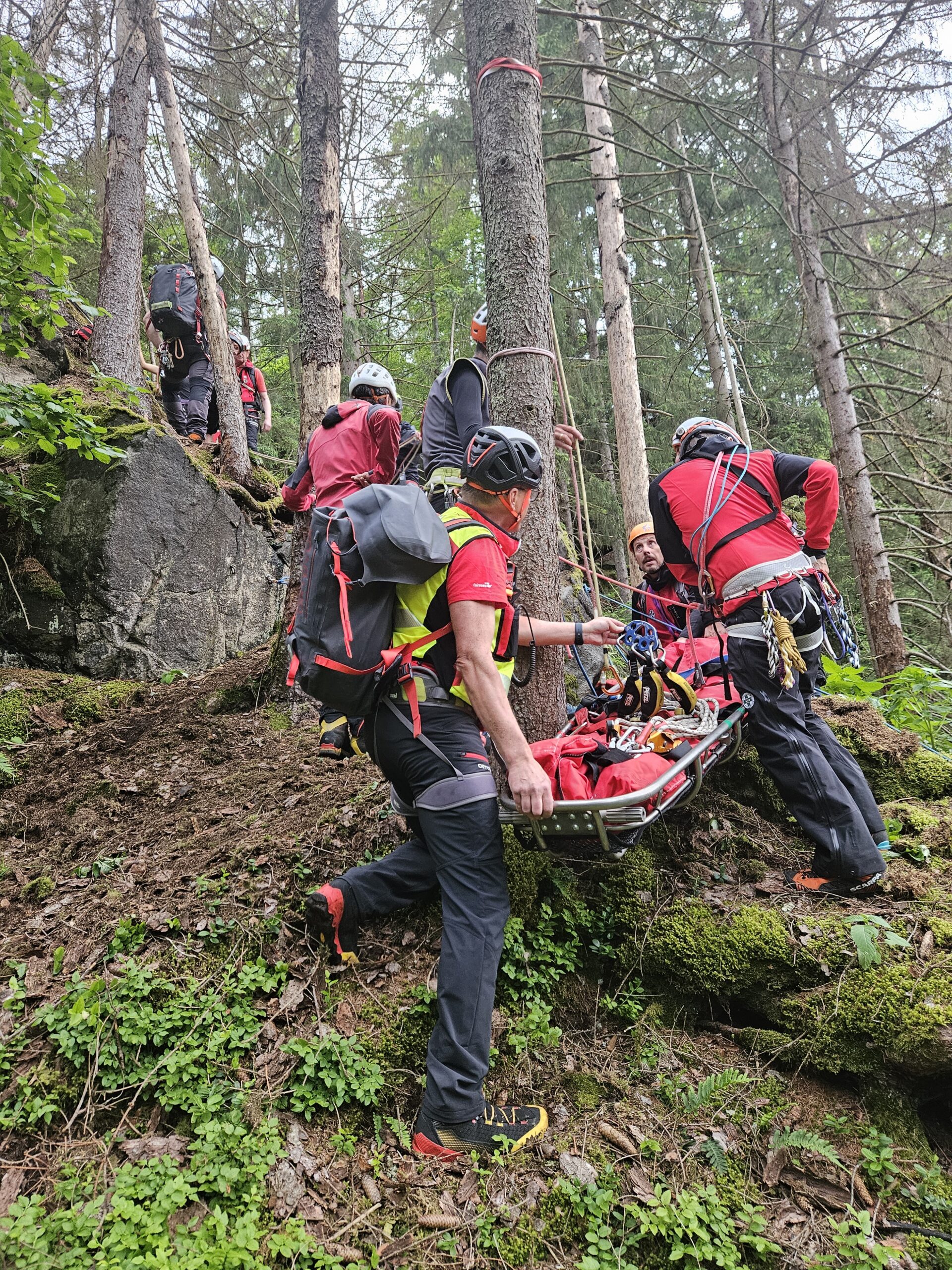 Unser Ausbildungsteam forderte uns an diesem Abend mit einem spektakulären Szenario: In unserem Klettergarten Spucher stürzte ein Solokletterer im Vorstieg. Dabei zog er sich schwere Verletzungen zu.