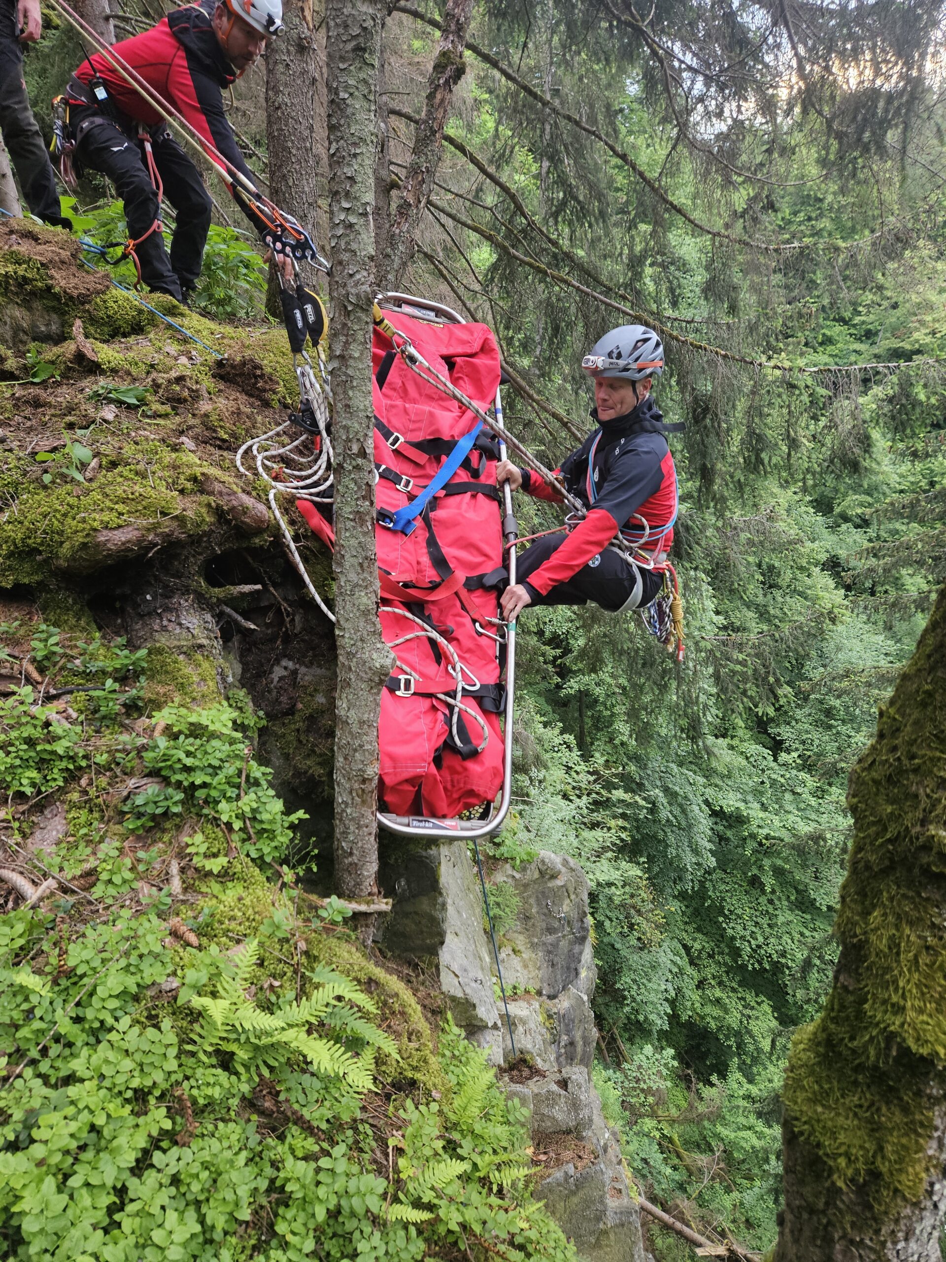 Die Bergung mittels Mannschaftsflaschenzug ging zügig voran und so konnte der Patient abtransportiert werden.
