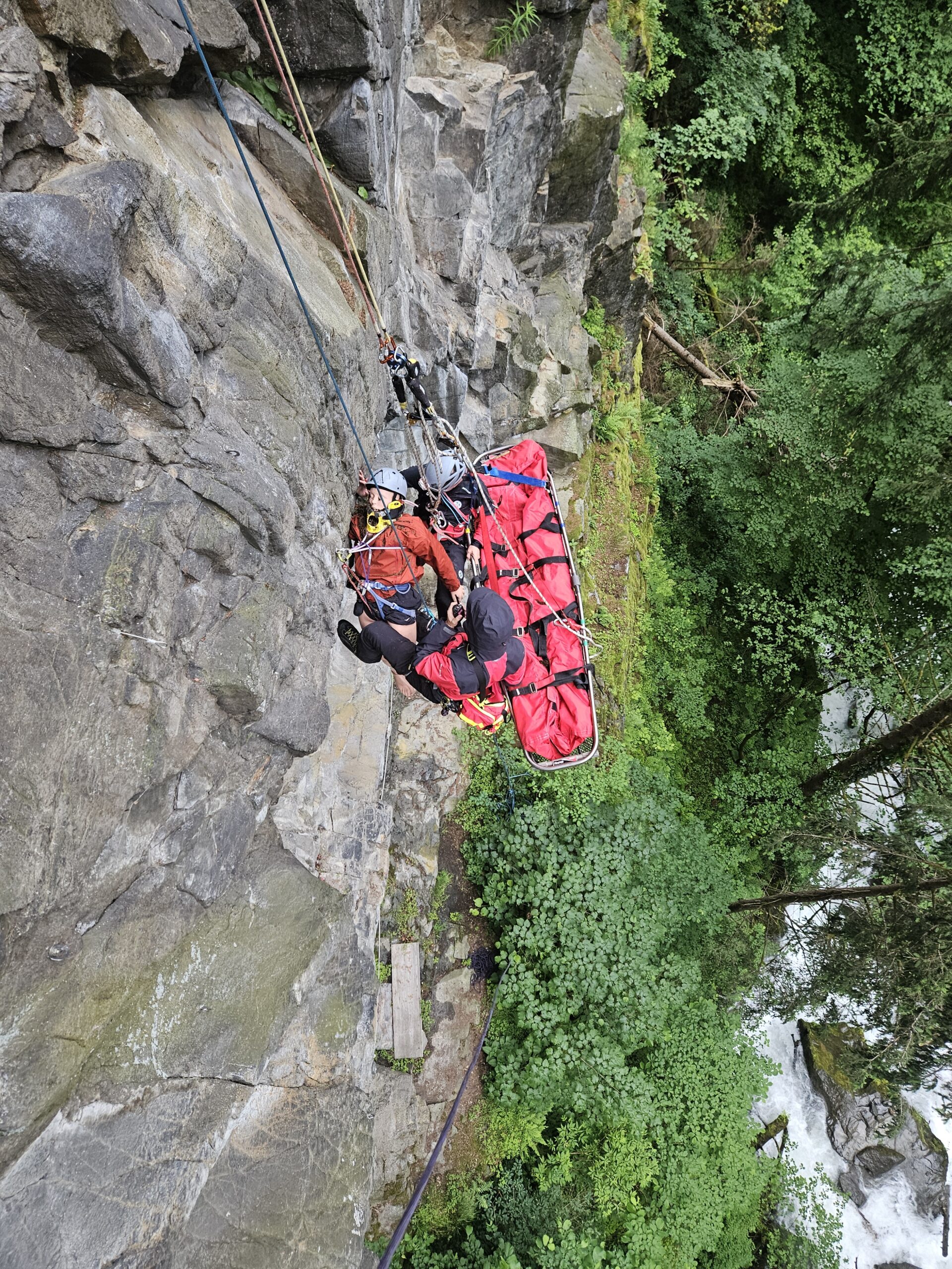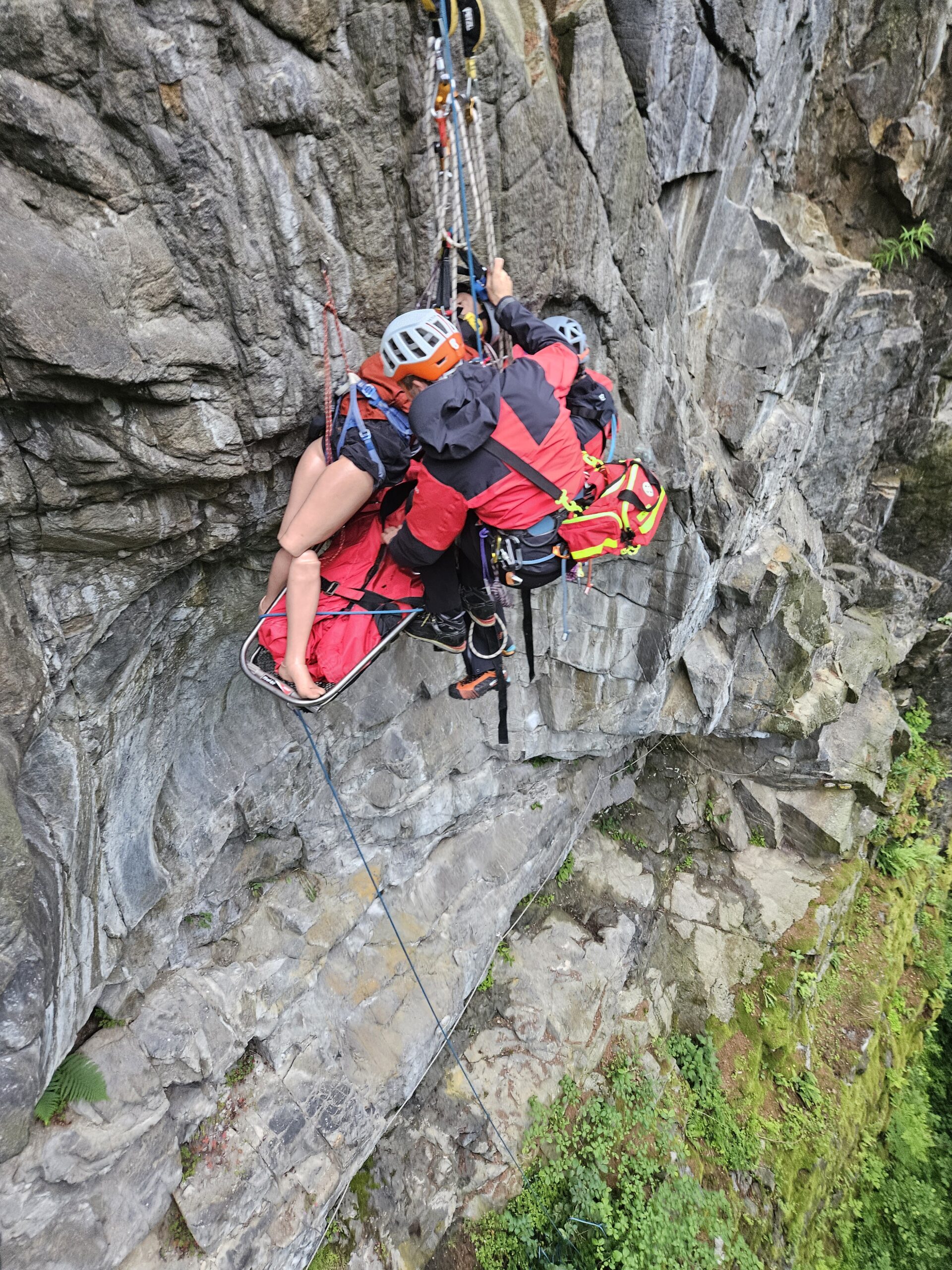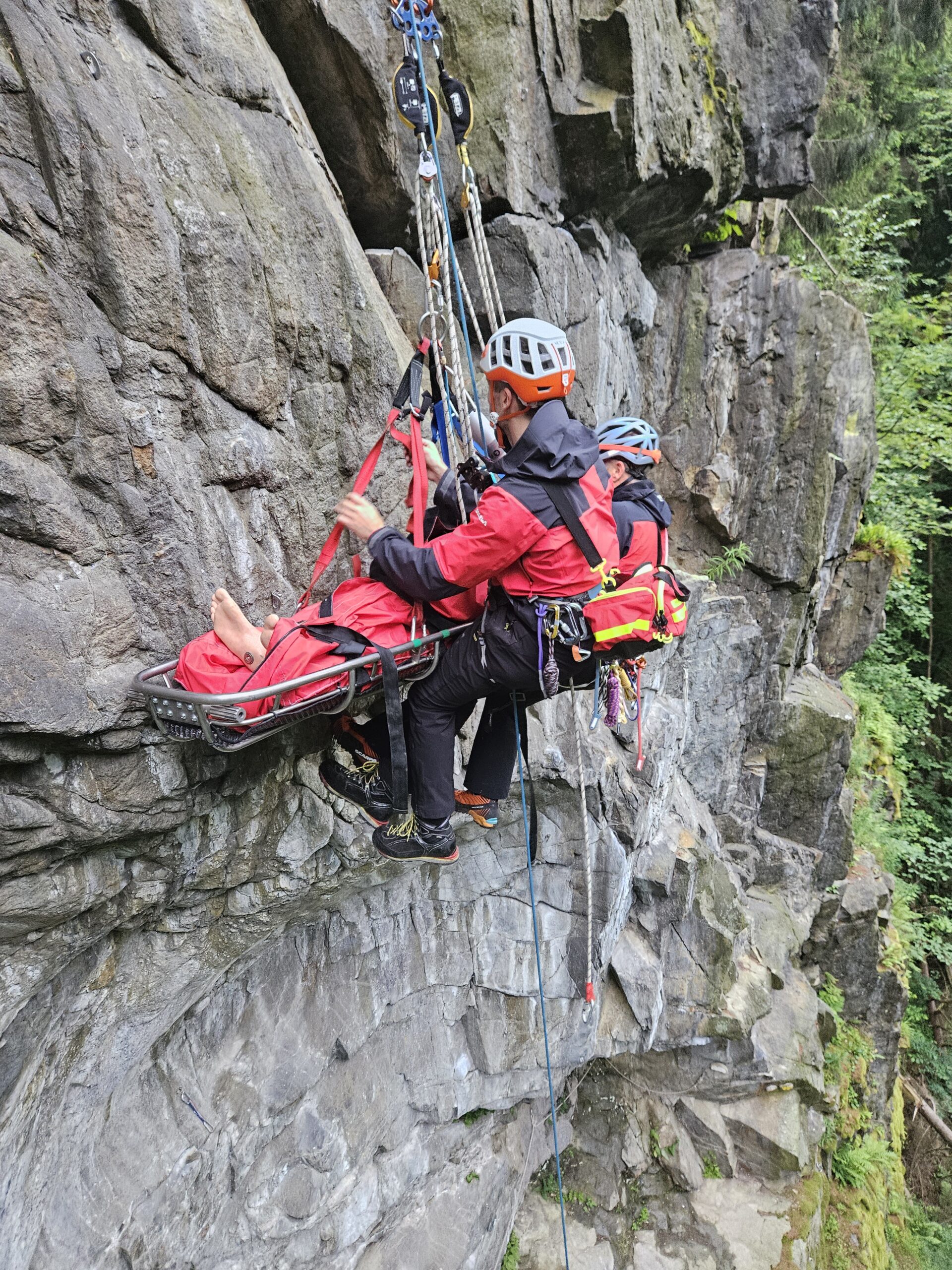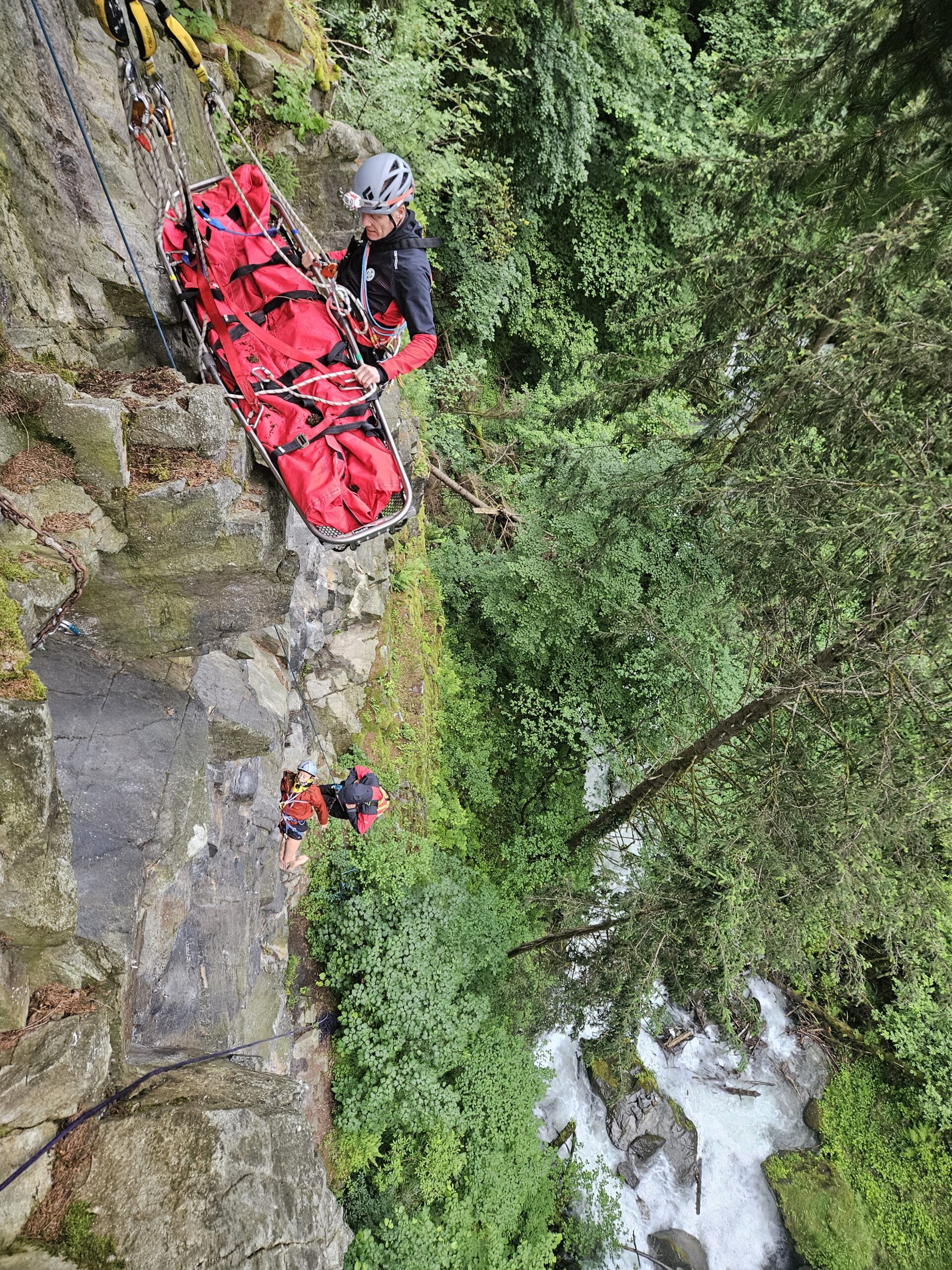 Insgesamt rückten 19 Bergretter:in aus. In solch exponierten Lagen ist ein kontrolliertes und wachsames Arbeiten notwendig und so wurden Schutzzonen gebildet. Das Medicteam seilte sich zum Patienten ab und nahm die Versorgung vor. Aufgrund des Verletzungsmuster sollte der Patient nach Möglichkeit liegend geborgen werden. Somit entschlossen wir uns die Gebirgstrage zu verwenden.